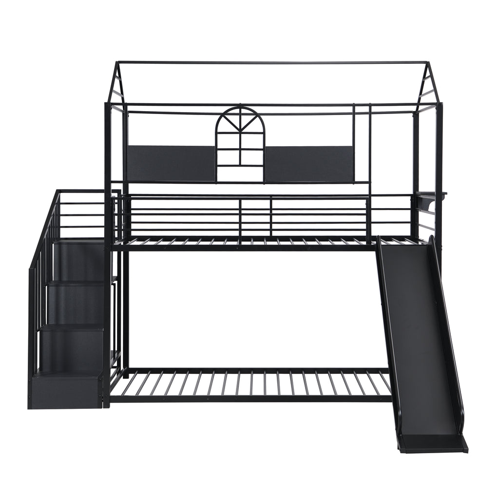 * This metal bunk bed crafted with a whimsical playhouse design, metal frame and some wood boards beside the window make it more exquisite and beautiful, this bunk bed offers kids a comfortable and exhilarating experience during both sleep and playtime that will let their imaginations run wild. you can with your kids decorated the bed frame with ribbons, tent or lanterns on the eaves. House-shaped frame provides extra fun to bedroom