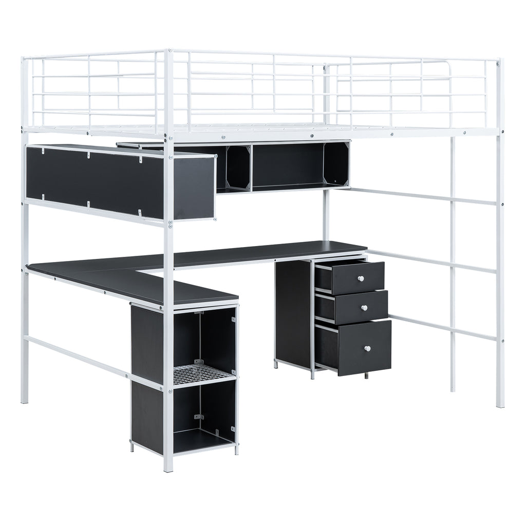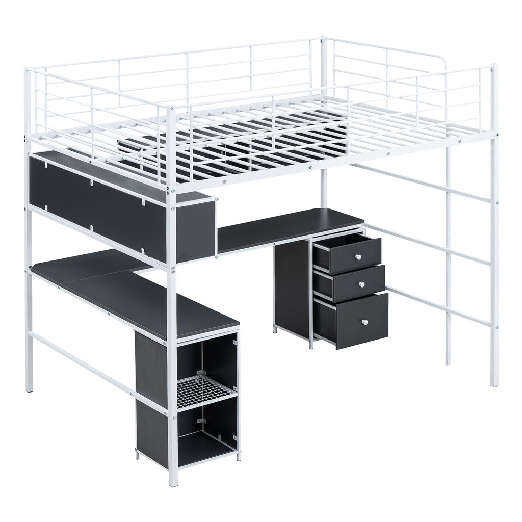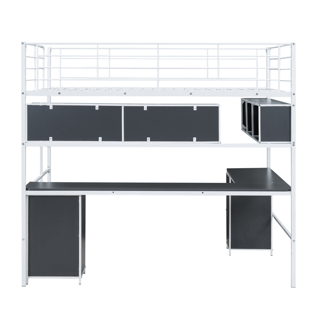 Metal Loft Bed with bookcase, desk and cabinet, Full, White