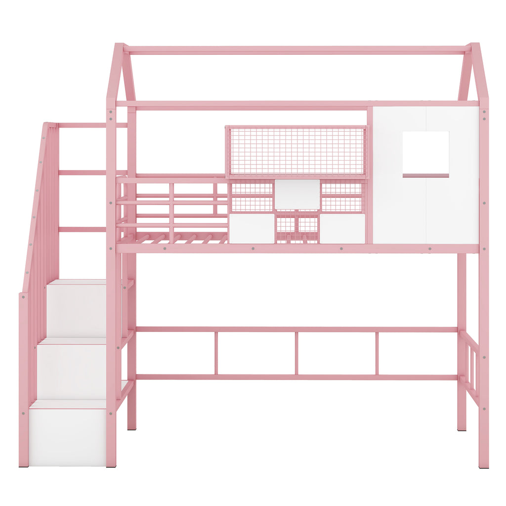 Metal Loft Bed with roof design and a storage box, Twin, Pink