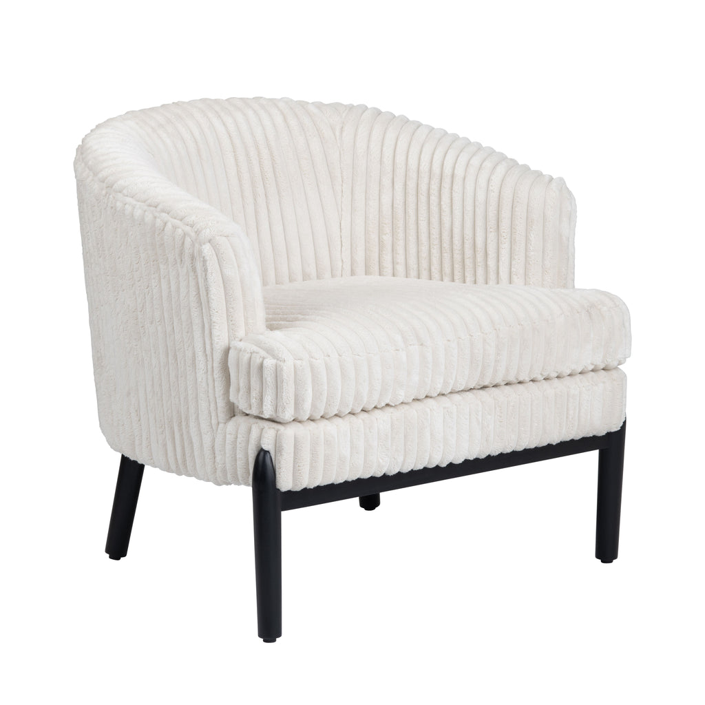 The Mily Accent Chair by Crestview Collection showcases a clean-lined, sculptural profile that exudes effortless elegance. The solid natural wood base and legs are coated in a deep, black finish and serves as a sturdy foundation for the design. Situated upon the frame is a barrel-style seat that features plush, white boucle upholstery and ridge pattern stitching. This stunning combination of black-stained wood and sumptuous fabric is a timeless pairing, adding modern appeal and unparalleled comfort to the piece. Its versatile appeal bridges the gap between classic sophistication and contemporary luxury that is sure to complement a variety of interiors.