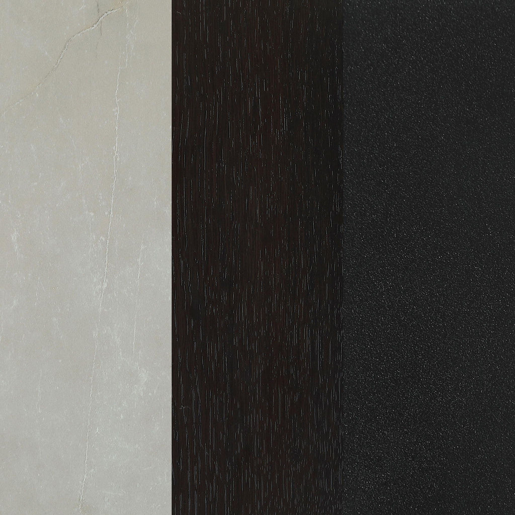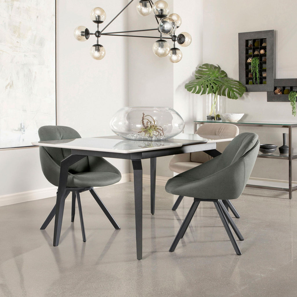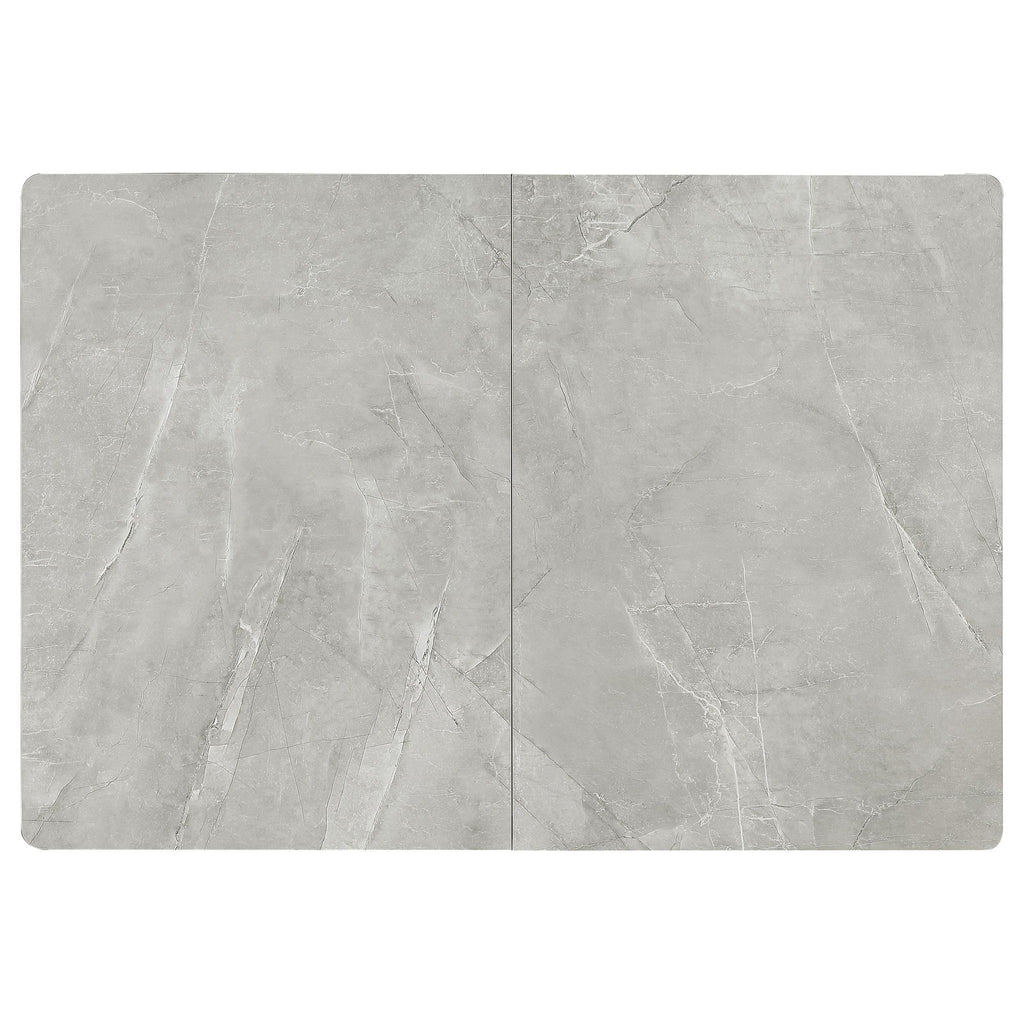 Sleek lines and sharp angles come together to create this elegant modern dining table. Designed with a gray ceramic tabletop designed to resemble marble, this dining table offers a strong and stable surface for entertaining guests. A self-storing butterfly leaf mounted on smooth metal glides lends additional space for extra guests too. Beveled edges and rounded corners soften the look of the stark lines of contrasting finishes. Long legs in a sandy black finish jut out from the top, offering a striking visual interest.