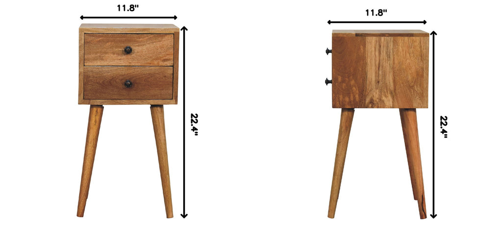 - Mini 2 Drawer Nightstand - This beautifully designed bedside is constructed from 100% solid mango wood and has a fine finish. It features 2 small drawers giving the piece extra character and dimension. It has 4 Scandinavian-style legs to modernize your home and can be fitted in a tight compact space to go in any type of home interior.