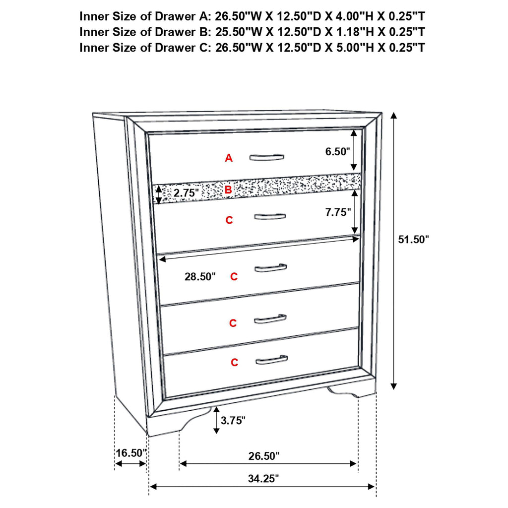 Sparkling trim brings the glamour of diamonds to this five-piece modern bedroom set. Designed to make a statement, it showcases a deep black finish with tuxedo inspired design elements that add glittering allure. The set centers on a chic bed, complete with an upholstered headboard and low footboard that create an airy, inviting pairing. The dresser, chest and nightstand each add ample storage, perfect for an organized bedroom ambiance. Each piece is complete with sparkling trim and jewelry inspired bar pulls on its drawer fronts that pull the look together perfectly.