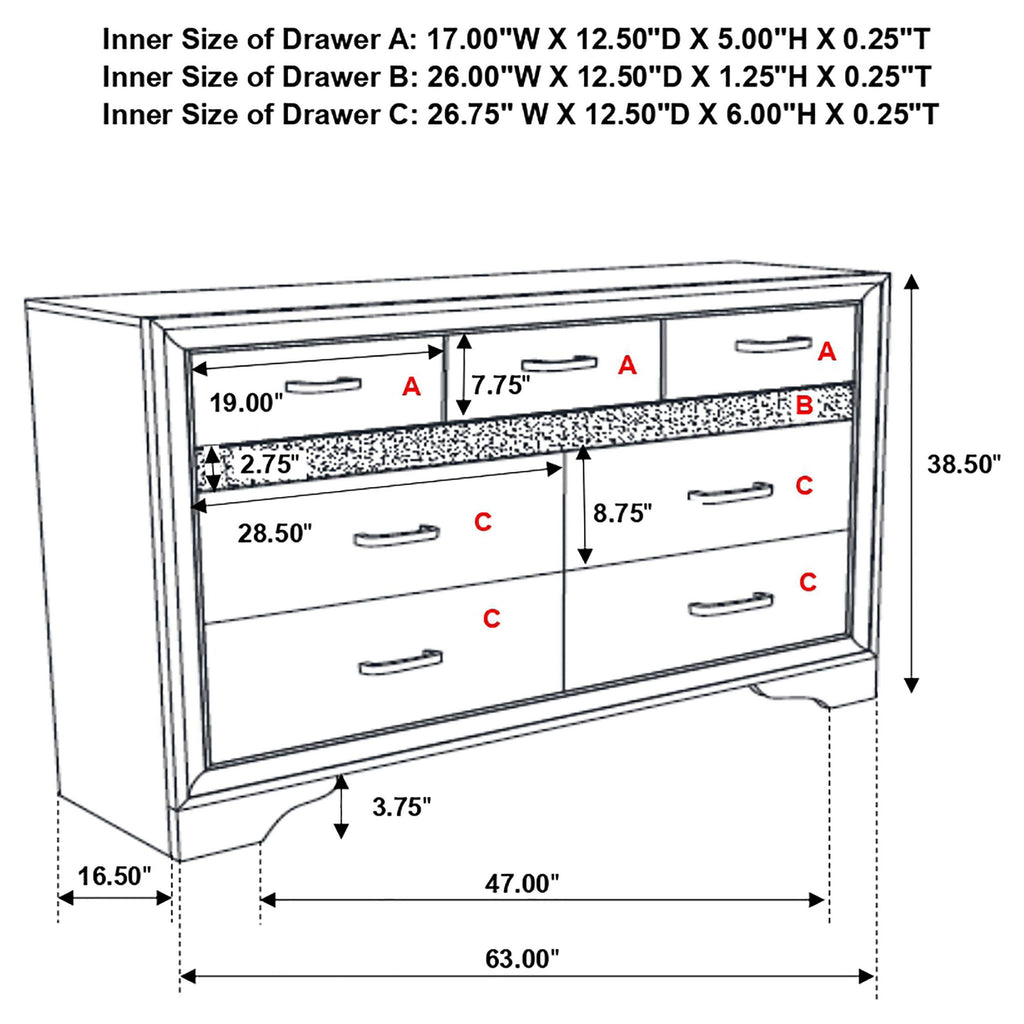 Sparkling diamond-like trim ups the glamour for a five-piece modern bedroom set. Compelling in its elegant simplicity, it centers on an upholstered bed and features a lightly textured white finish paired with smooth white molded trim. A nightstand, dresser with mirror, and chest provide plenty of drawers for easy storage and organization. Stripes of glittering, diamond-like trim and jewel-like bar pulls elevate the set, creating a fresh, sophisticated look and feel for your bedroom. Bracket feet complete the look with a touch of movement.