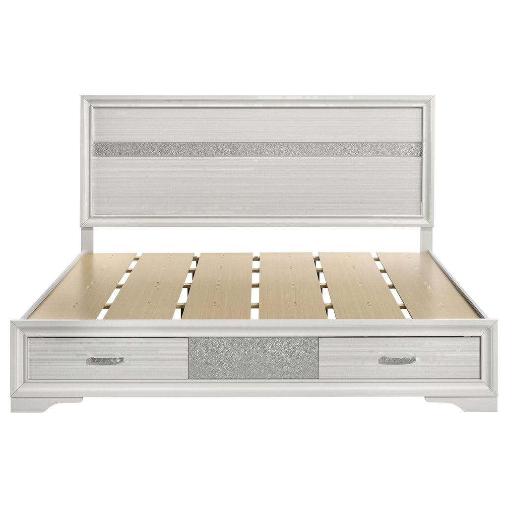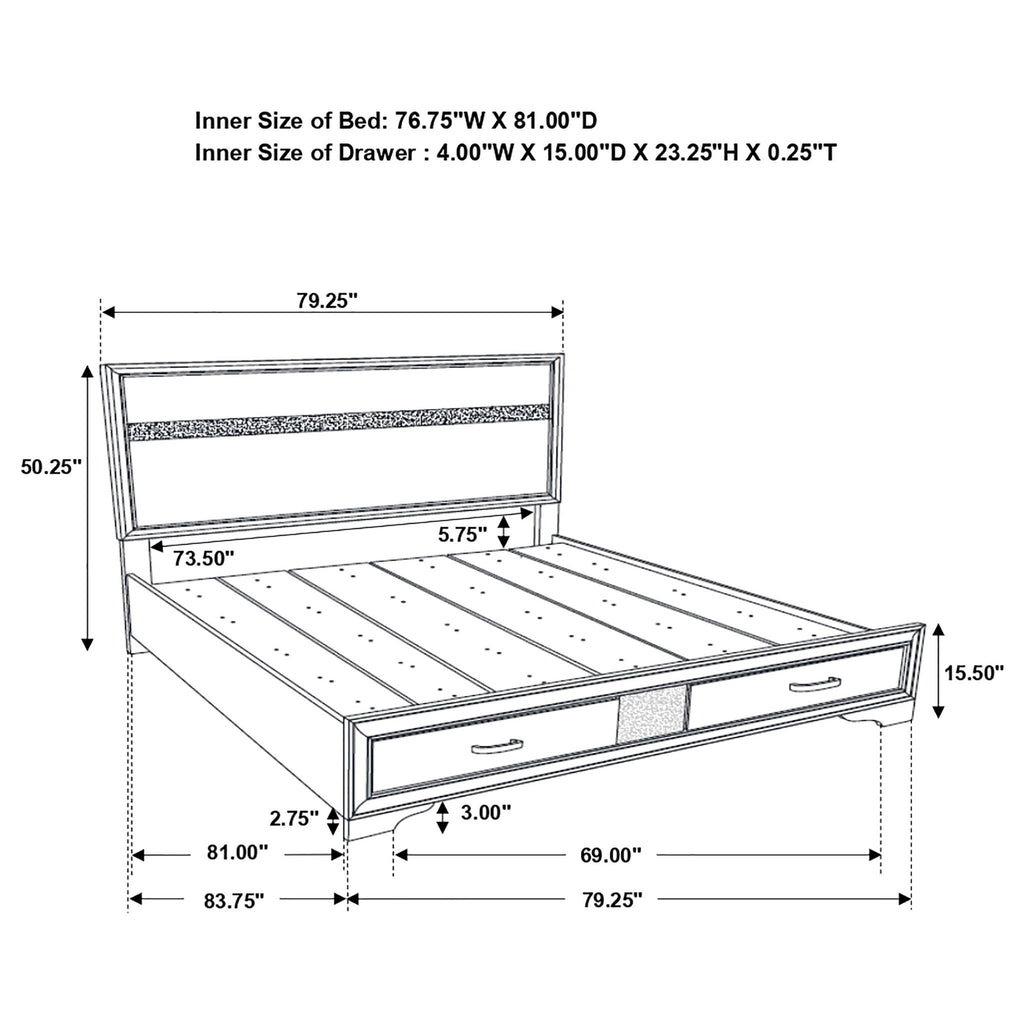 This alluring bed from the Miranda collection has both fashion and function. It features crisp lines and a headboard that's as simple as it is impressive. The footboard is built with two roomy drawers to hold extra sheets and blankets. The bed has an effortless timelessness and elegance. Add to the bedroom for a charming ambiance that's sure to please.