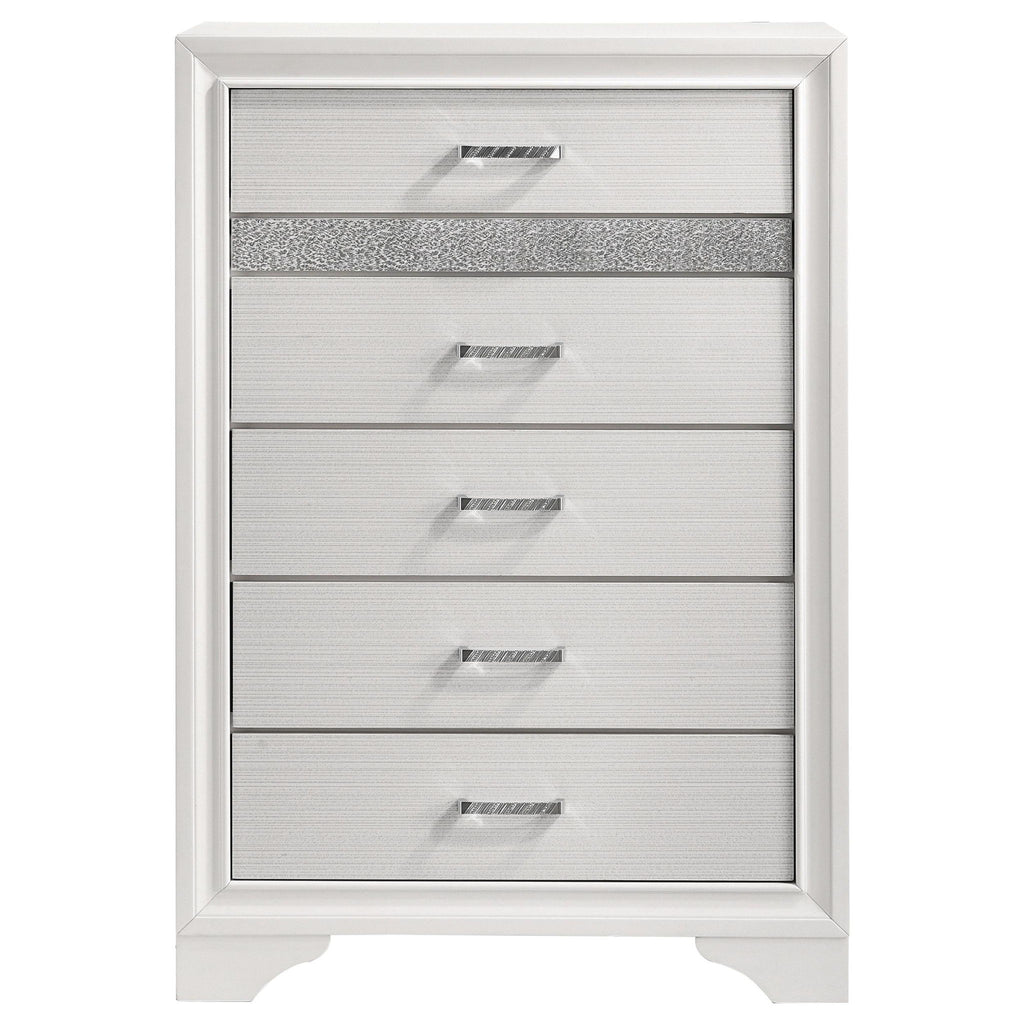 Add posh, upscale ambiance to your bedroom decor. This chic, stylish chest livens up a room with a dazzling touch of sparkle. With a hidden jewelry drawer built in, it keeps valuable items safe and secure. Its drawers are lined with felt for a luxurious hint of softness. Its six convenient drawers are built with metal extension glides for versatile ease of use.