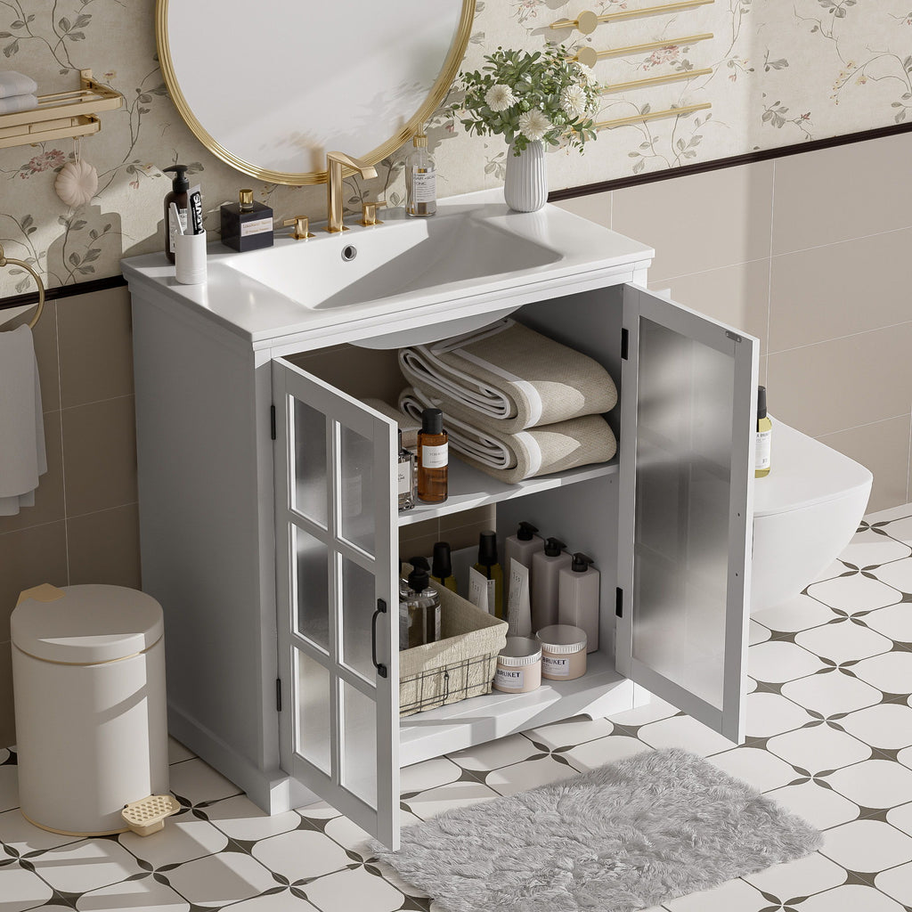Bathroom Vanity With Sink, Tempered Blurred Glass Doors - White