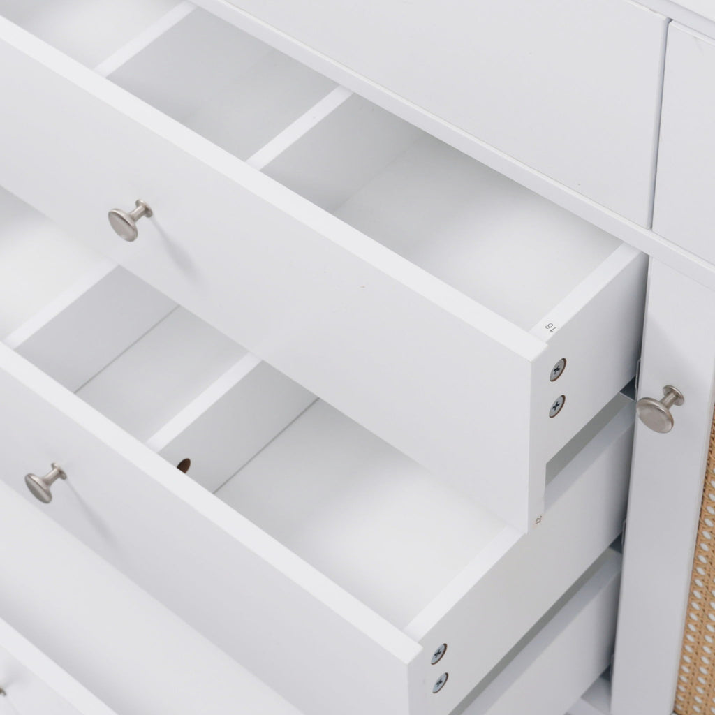 - Smart Storage Organization: Five soft-close drawers and two rattan-front cabinets offer flexible, categorized storage for small and large items.