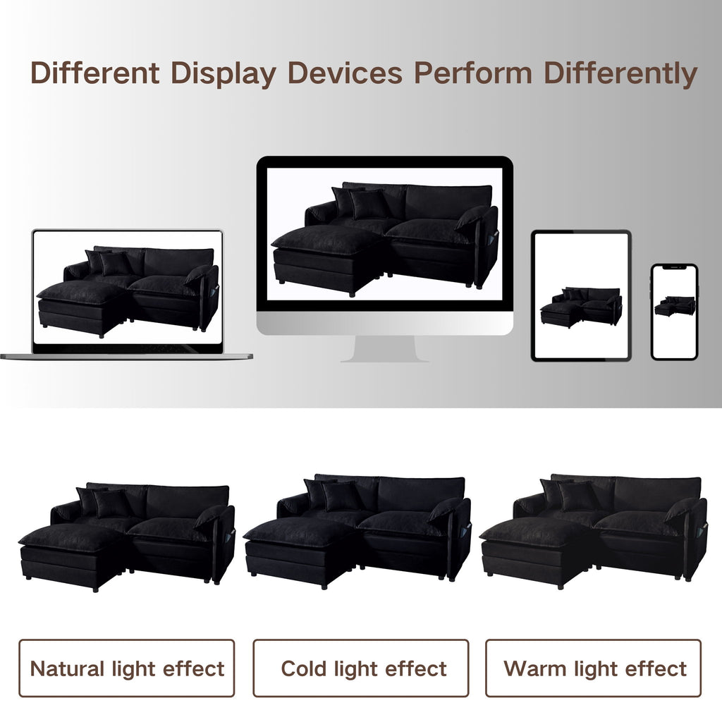 Modern Chenille Oversized Deep Seat Sectional Sofa, Large 3 Seater Modular With Pillows - Black