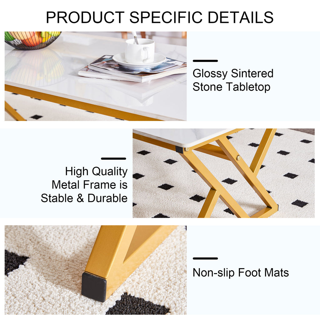 Modern Marble Pattern Coffee Table With Metal Legs, Sintered Stone Surface - White / Gold