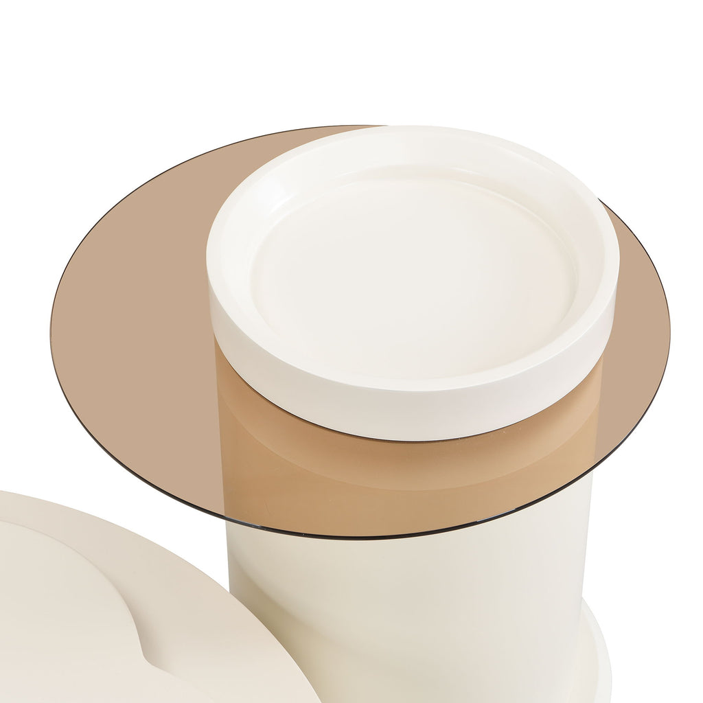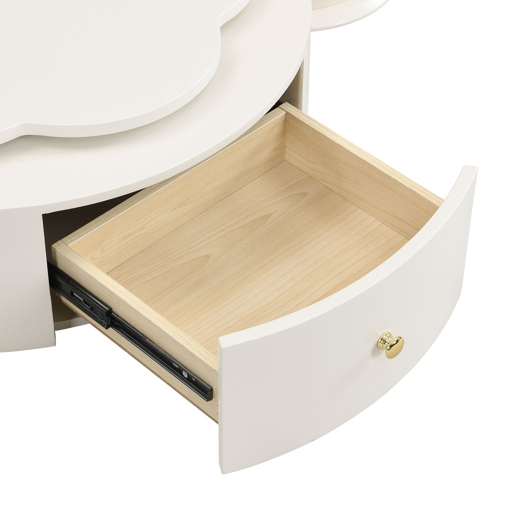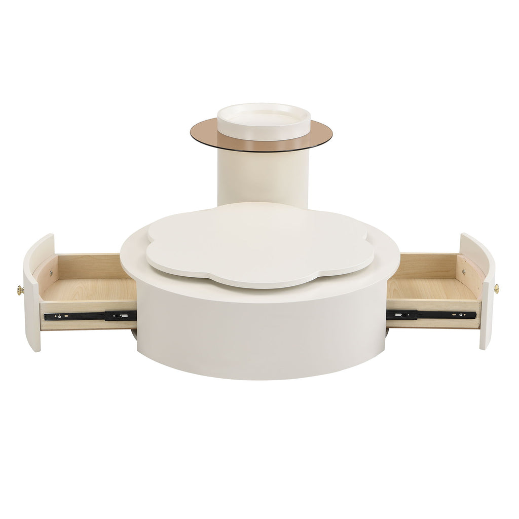 Modern Round Coffee Table (Set of 2), 360 Degree Rotatable Flower Shaped Top With 2 Drawers, Top Circle Side Table End Table With Glass For Living Room - Off White