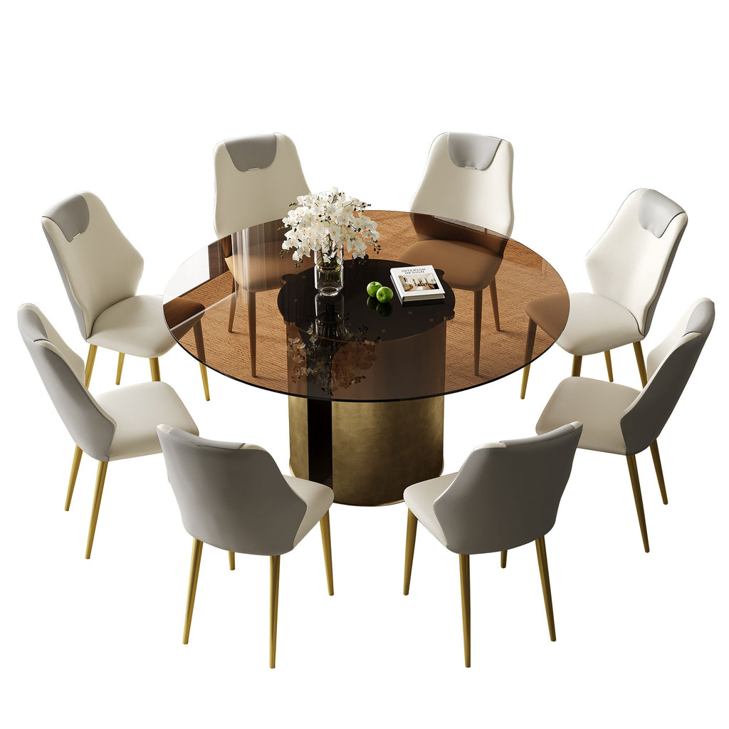 Round Dining Table Set With Glass Top, Suitable For Kitchen And Living Room (1 Table With 8 Chairs) - Brown