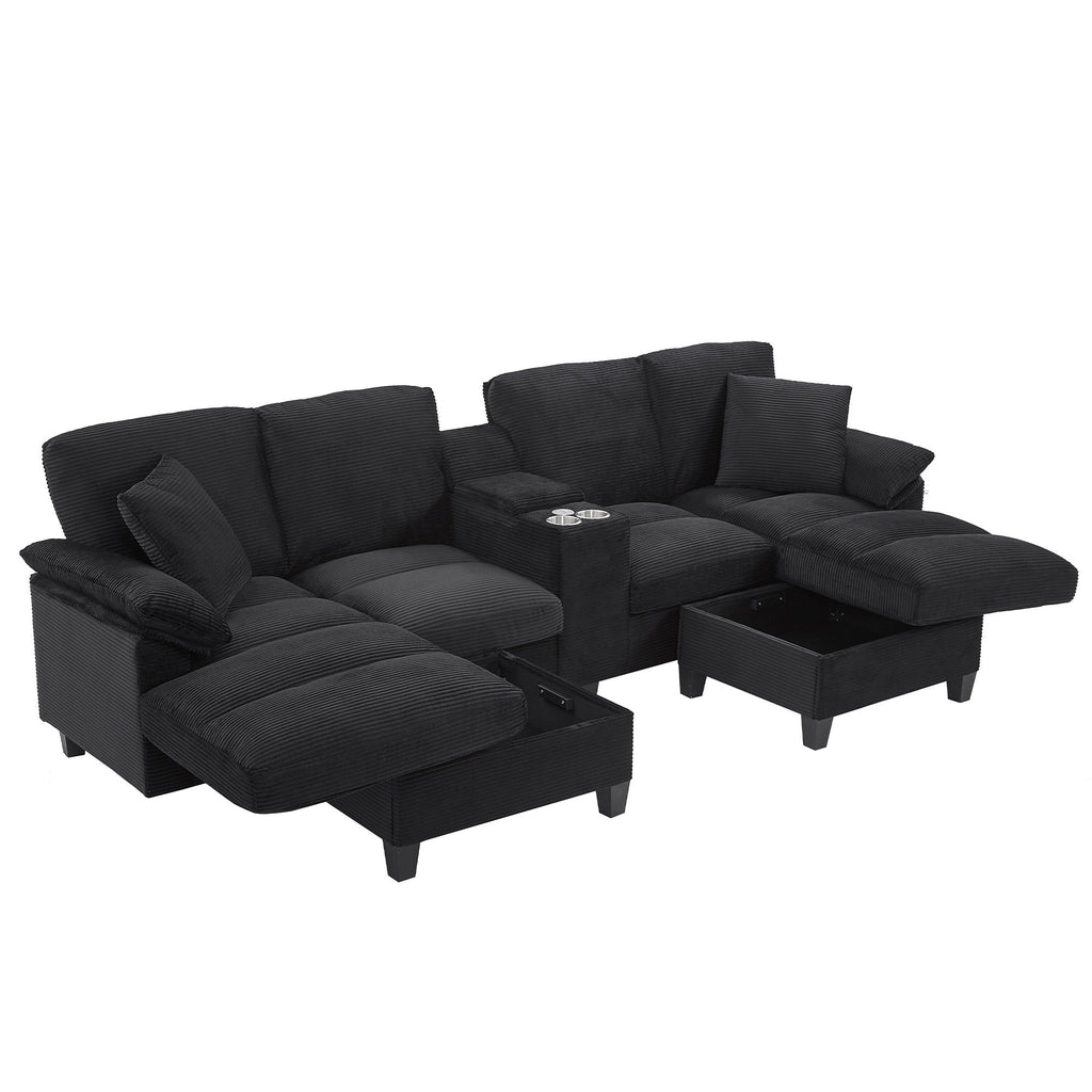 U-Shaped Sectional Sofa, Hidden Storage Ottomans, USB Ports, And Cup Holders - Black