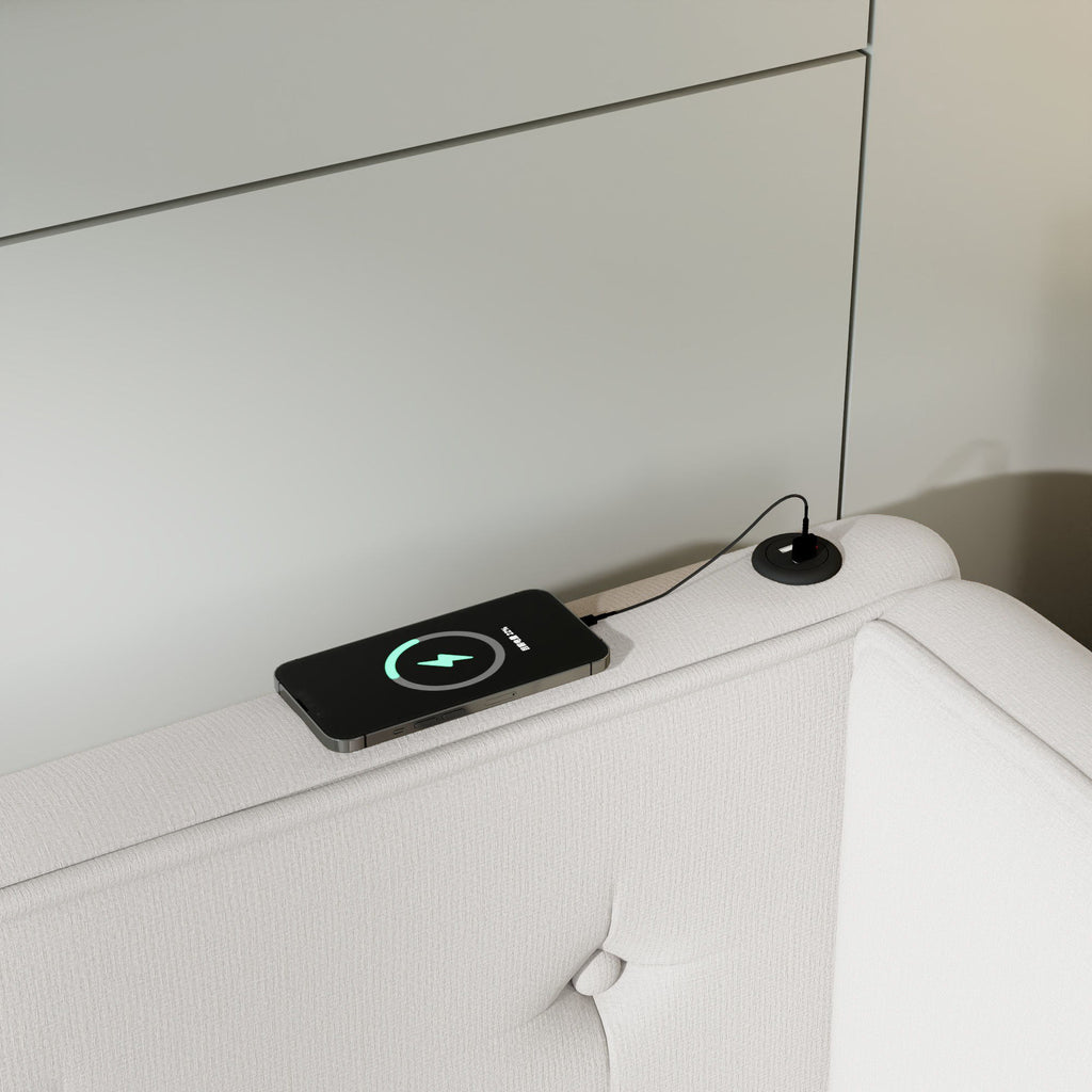 Upholstered Queen Size Platform Bed With USB Ports And LED Belt - Beige