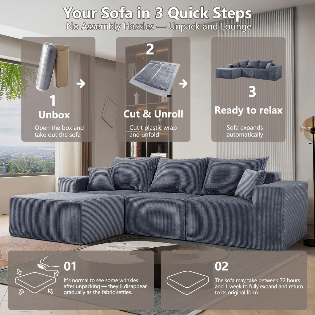 4 Piece Modular L Shaped Sectional Sofa With Spacious Chaise Lounge Corduroy Upholstery - Gray