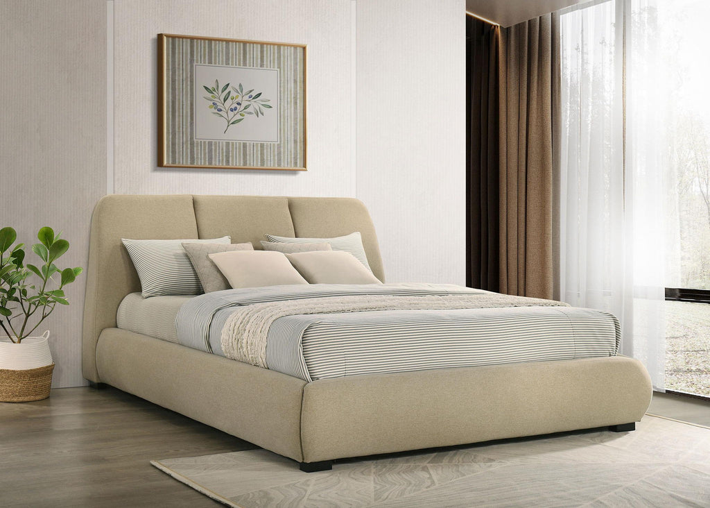 Softly sculpted and thoughtfully tailored, this upholstered platform bed brings a quiet elegance to modern sleep spaces. Its curved silhouette flows from a gently flared headboard to rounded side rails, offering a sense of movement and ease. Three stitched panels add subtle dimension, while the built-in slat system provides durable mattress support without the need for a foundation. Crafted from engineered wood, it balances sculptural form with everyday comfort.
