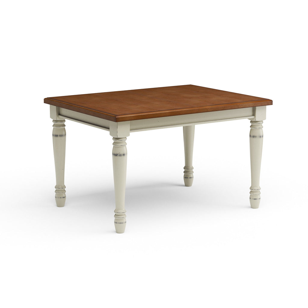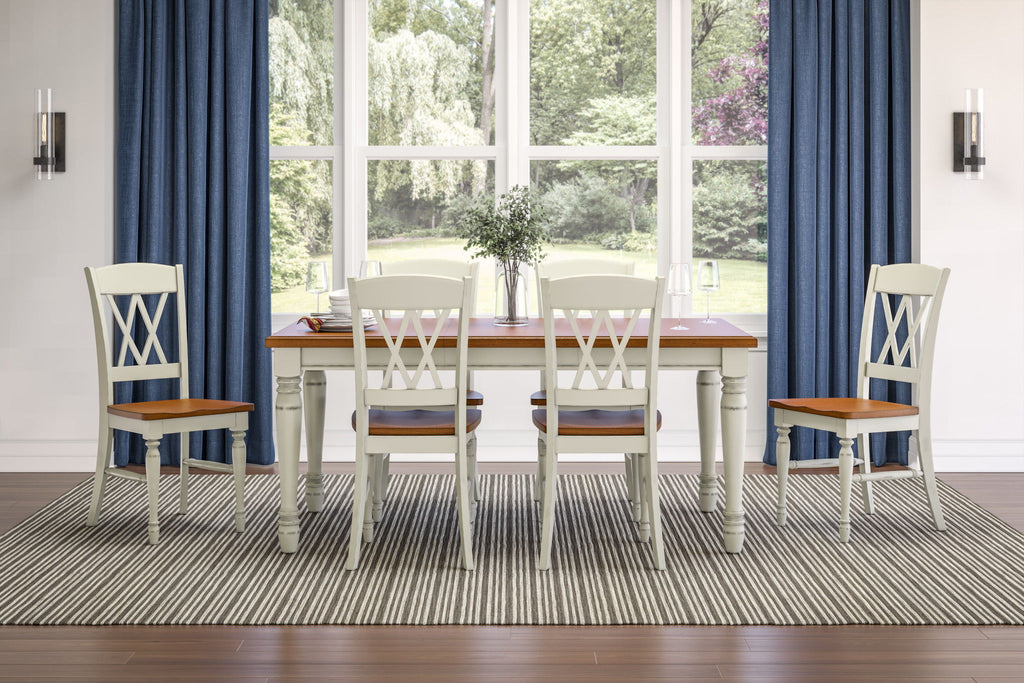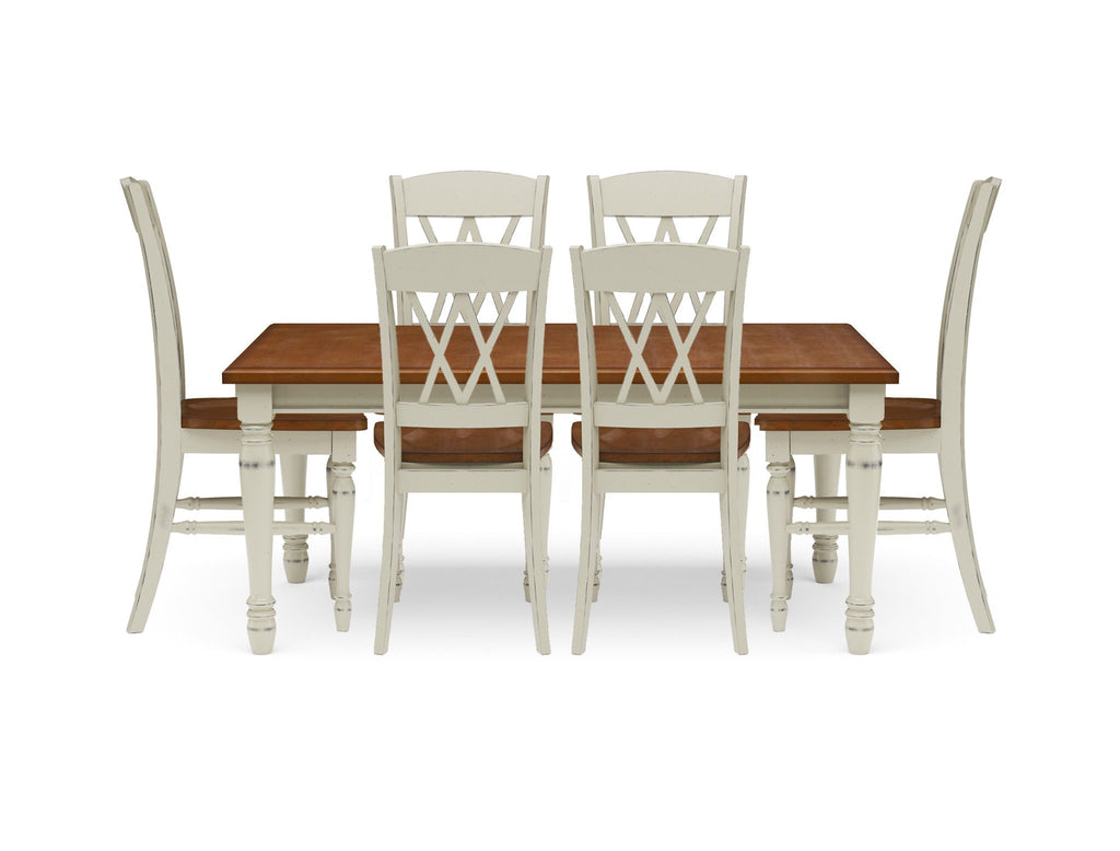 The Monarch Rectangular Dining Table and Four Double X-back Chairs by homestyles blends upscale design with functionality. This stylish dining set blends hardwood solids, engineered wood, and veneers with a rubbed off-white, nine-step distressed oak finish. This set projects striking style with sophisticated, solid wood turned legs with intricate carved detail.