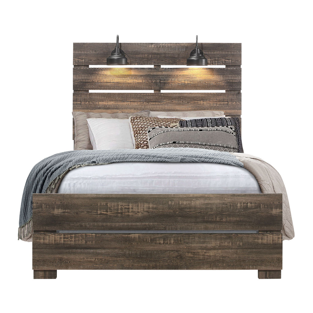 Monica - Queen Bed With Headboard Light And Panel Design - Dark Oak