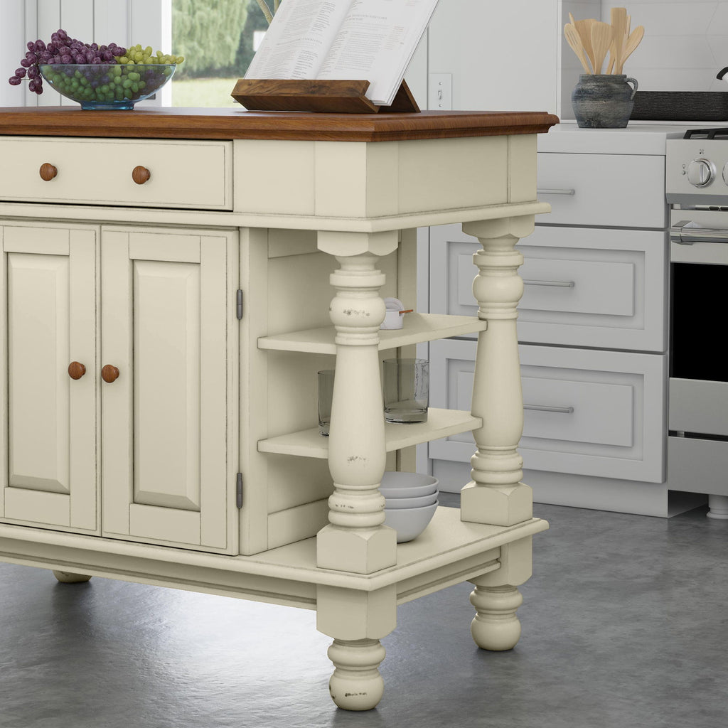 - Distressed off-white base finish and oak finished top creates an aged, well-worn and unique vintage look.
