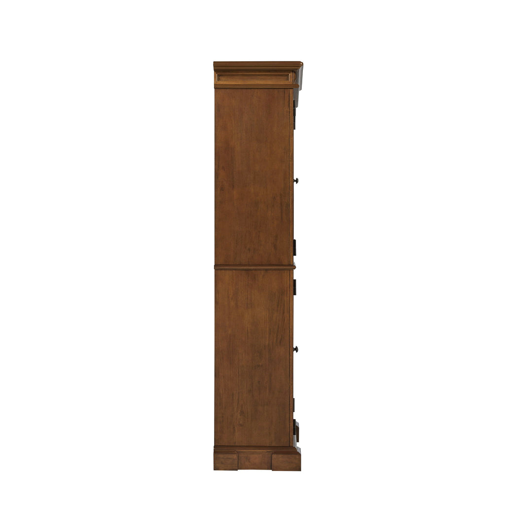 The homestyles Montauk Cherry Pantry is made from beautiful solid hardwood frames with recessed panel doors in a warm finish. The finish blends with all types of existing decor. Ample storage can be found in top and bottom cabinets, each with a fixed shelf and two adjustable shelves. Hardware is antique brass to accent the traditional design. With its clean design and economical use of space, the Montauk pantry offers flexible storage space in the kitchen or linen closet. Also included is hardware for an optional wall anchor and an anti-tip kit to ensure safety. It comes carefully packaged with all items labeled and easy-to-follow assembly directions.