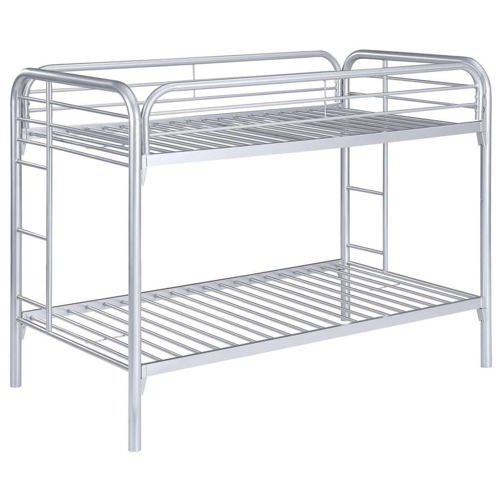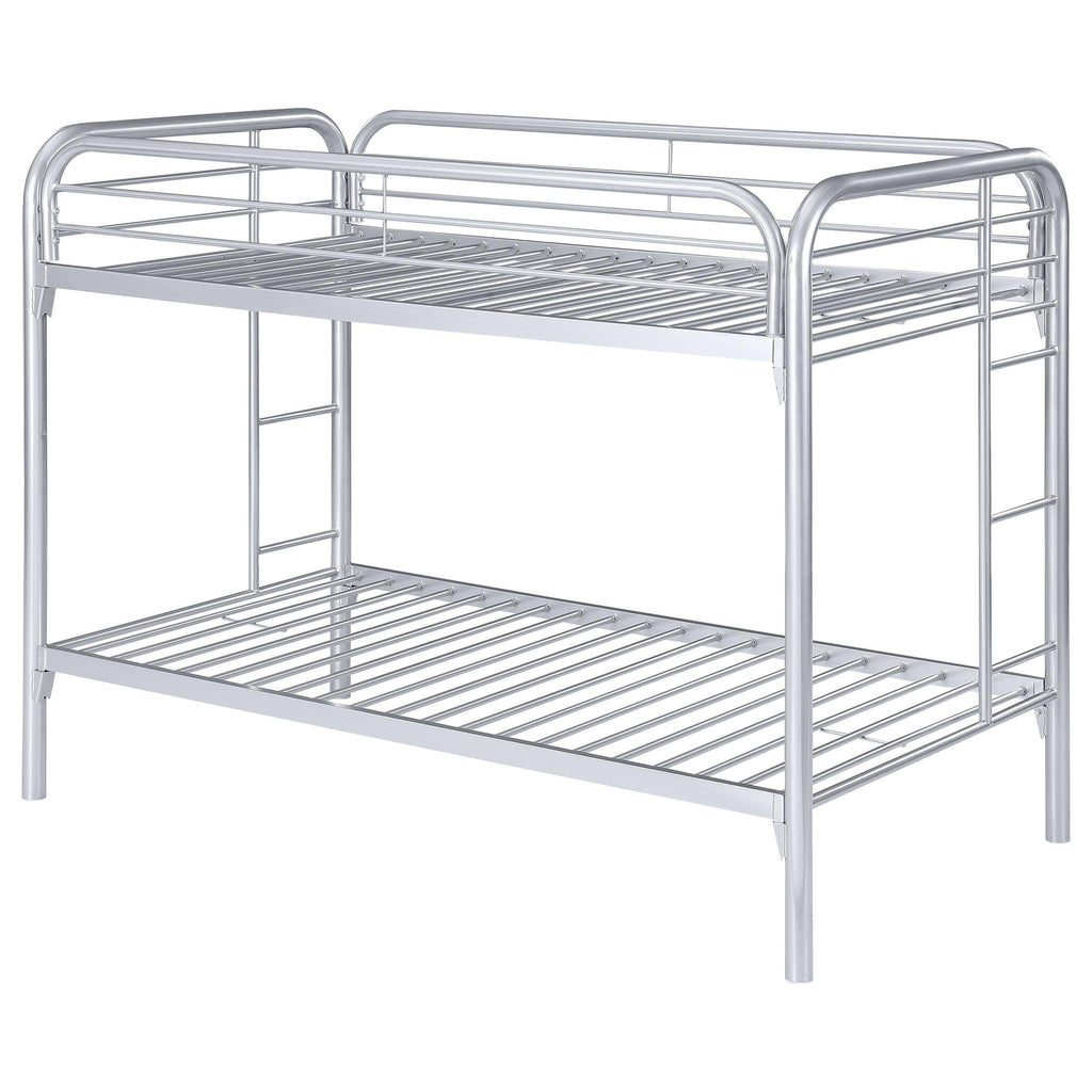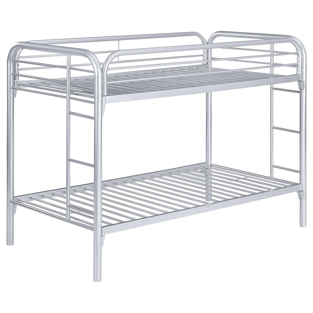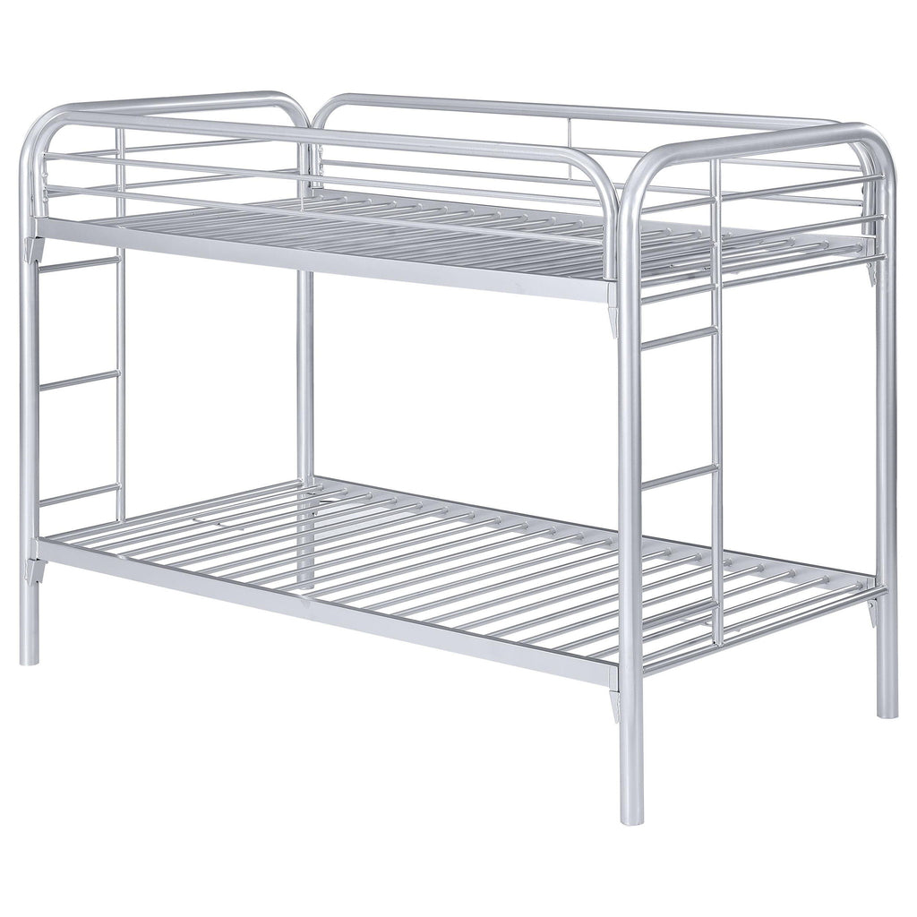 This bunk bed has youthful convenience and comfort. Top bunk has a slatted railing to ensure a safe, restful sleep. Each end features a ladder for easy up-and-down access. Metal frame is finished in lustrous silver for a contemporary ambiance. With a 20/20-piece slat kit included, this bed brings fun and luster to the bedroom.