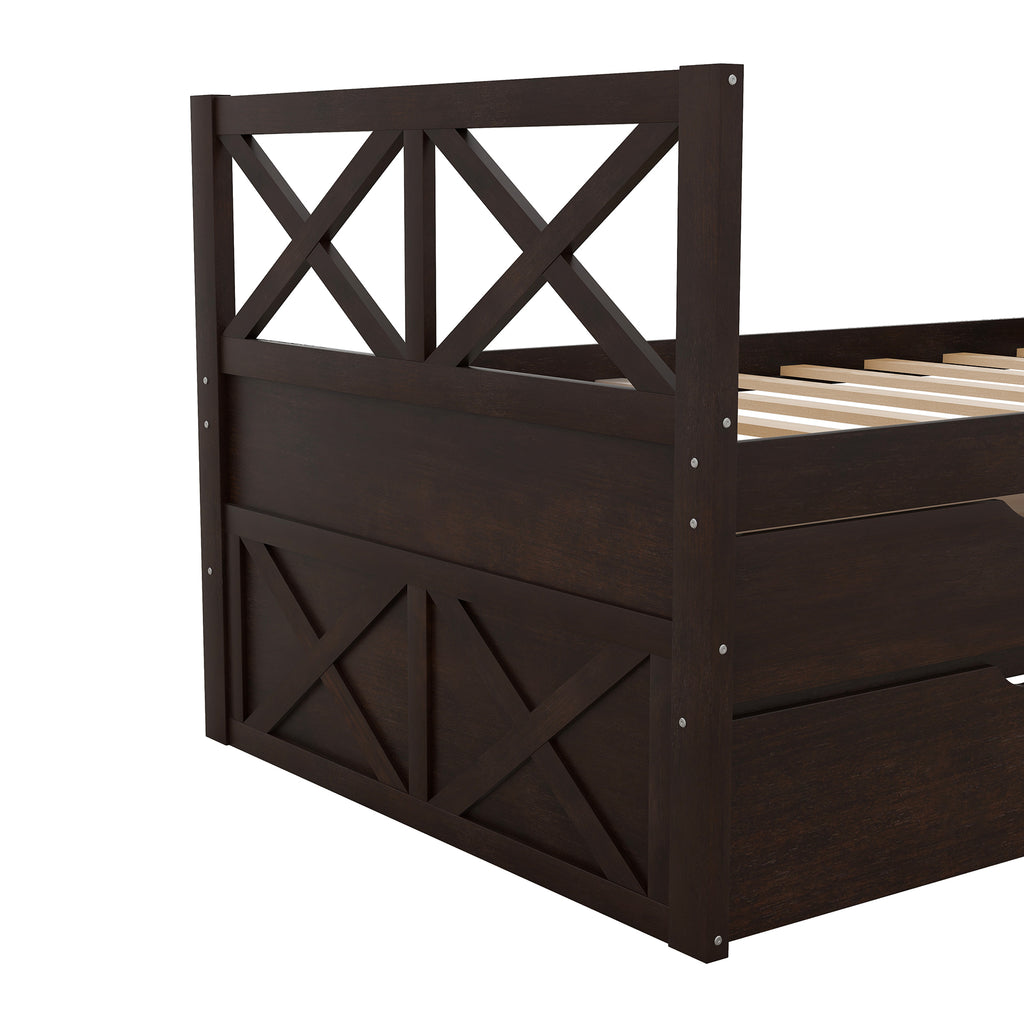 This daybed provides multiple function to meet your various needs. Coming with two drawers, the bed provides great storage function to store away your stuff or bedding. There's a trundle under the drawers which is ideal for accommodating sleepovers or friends, perfect for bedroom or guestroom. Featuring X frame on side, this bed adds a dose of rustic style to your room, elegant and suitable for any room style. Crafted of solid pine wood and high-quality MDF, the bed provides great support and can serve your family for many years.