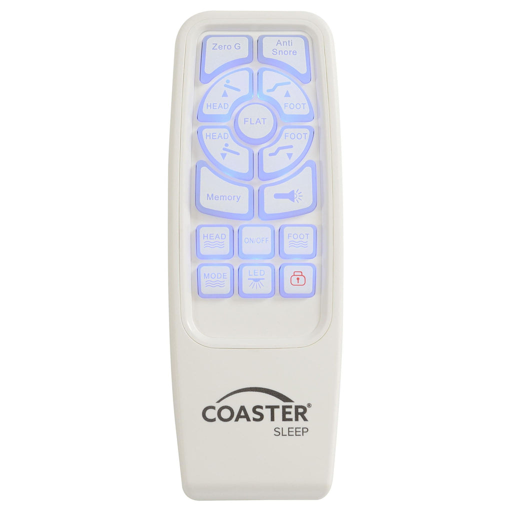 Revitalize yourself each and every night with this stunning multifunctional adjustable bed base with grey fabric trim and adjustable or removable legs. The bed base delivers the latest in modern technology with dual massage function on the head and foot of the bed, with three levels of intensity for optimal relaxation. The bed is equipped with a wireless remote that's backlit and gives full control of the height of the head and foot of the bed and includes presets for a most comfortable night's sleep. Each side of the bed is equipped with a dual USB port perfect for keeping bedside electronics charged and ready to use. You can even control the bed from your phone with Bluetooth connectivity and the Coaster app installed on your smart device. This premium adjustable bed base revolutionizes your bedroom into a relaxing multi-functional space and provides an abundance of features and customizable ergonomic positions to get great sleep and revitalize yourself.