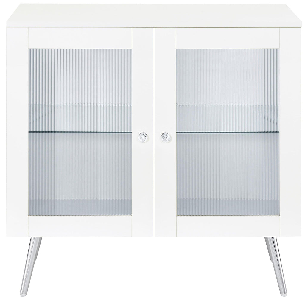 Step into a world where classic charm meets modern elegance with this 2-door accent cabinet. The crisp white finish on engineered wood construction is beautifully complemented by the textural contrast of rippled doors. Tapered steel legs, electroplated in chrome, give rise to two tiers of shelving, including a tempered glass shelf, all crowned with chic acrylic crystal knobs. This piece is not just a storage solution, but a statement that adds a touch of sophistication to any space.
