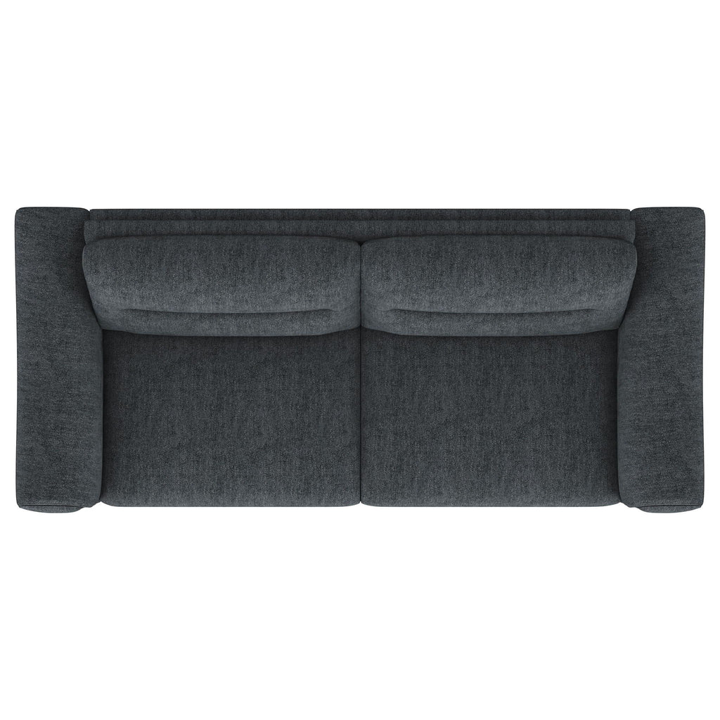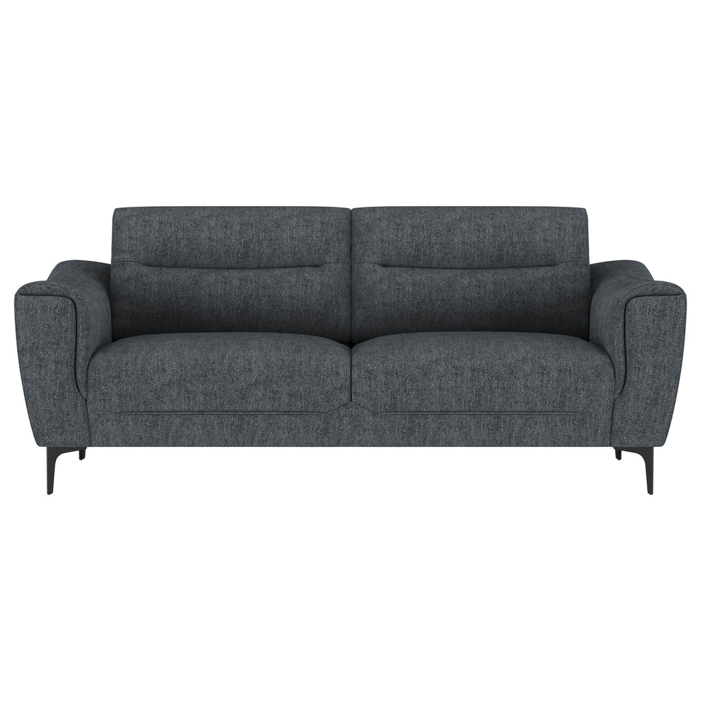 Indulge in effortless style and comfort with this chic transitional sofa. Soft charcoal upholstery gracefully harmonizes with any décor, while plush pocket coil seat cushions and modern track arms provide inviting support for your downtime. Designed with attached cushions for a neat appearance and innovative metal legs that allow for easy assembly, this collection elevates the overall ambiance of your living space.