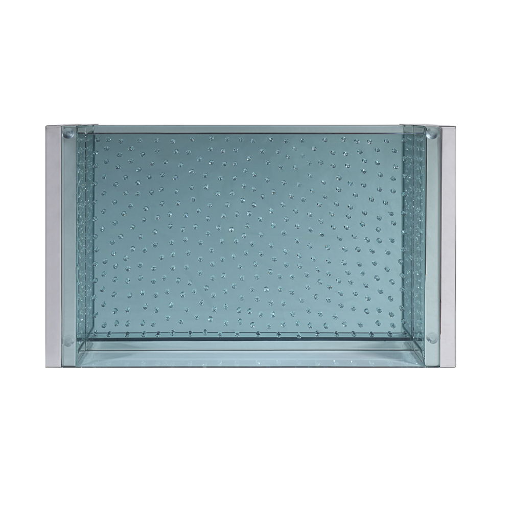 - Mirrored Sled Frame, Glass Top: 4mm Clear Tempered with Faux Crystals Inlay (Open Base)