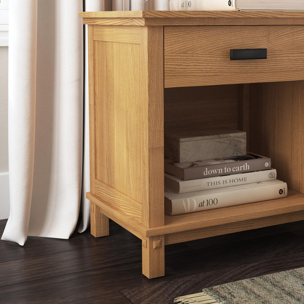 Uncomplicate your life with the simple beauty of the Oak Park collection. The Oak Park Nightstand by Homestyles is expertly crafted, with clean lines and intelligent design. Solid mahogany combined with engineered wood creates an attractive and durable piece. The drawer offers a convenient place for all your bedside items, and the open space below is perfect for storing books, tablets, and more. Classic black painted finish and unique rectangular black pull round this piece out. The Oak Park nightstand will pair perfectly with existing furniture or combine it with our matching bedframe to complete your look.