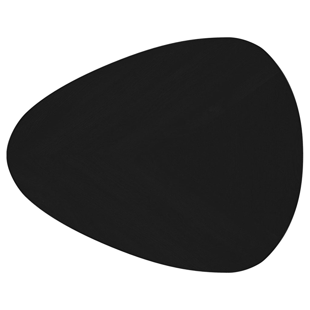 Introduce a modern flair to your living room or den with this sleek wooden end table. Finely crafted from solid mango wood, its deep black finish enhances its timeless elegance. The triangular tabletop features rounded corners, lending a softened, contemporary vibe. Supported by three tapering, splayed legs, the design exudes a light and airy feel. Perfect for flanking a sofa or armchair, this side table is ideal for showcasing a reading lamp or decorative accents.