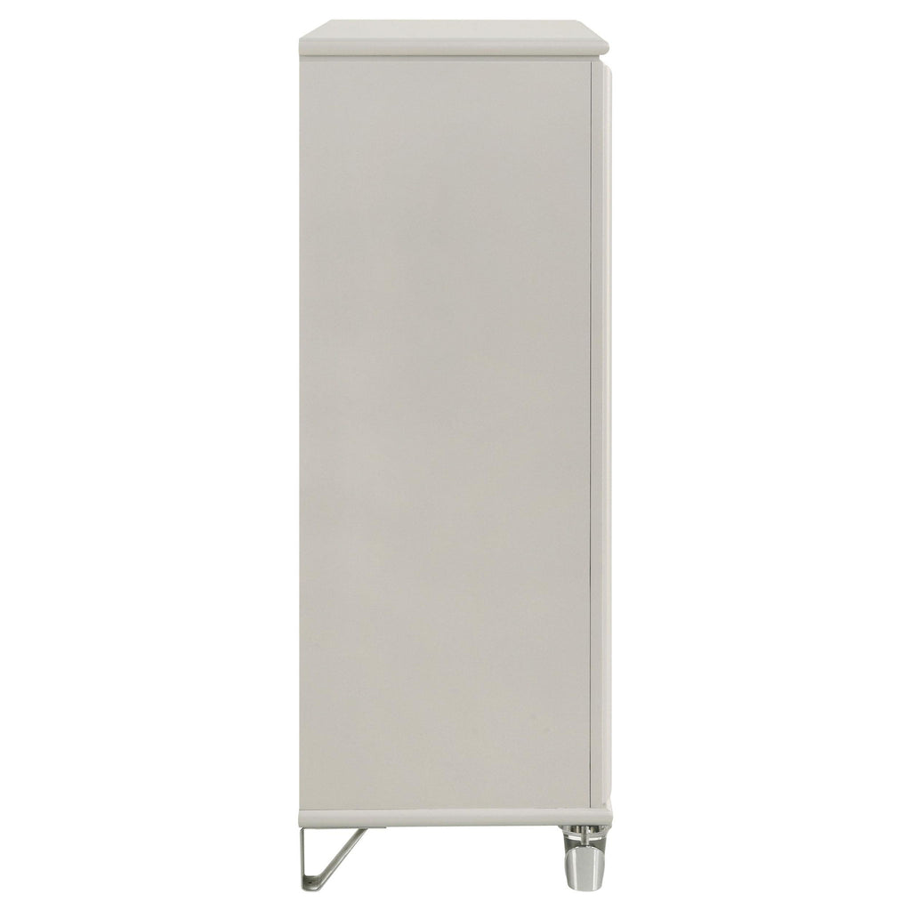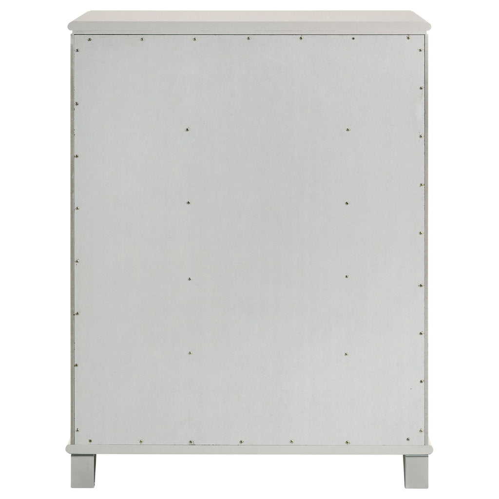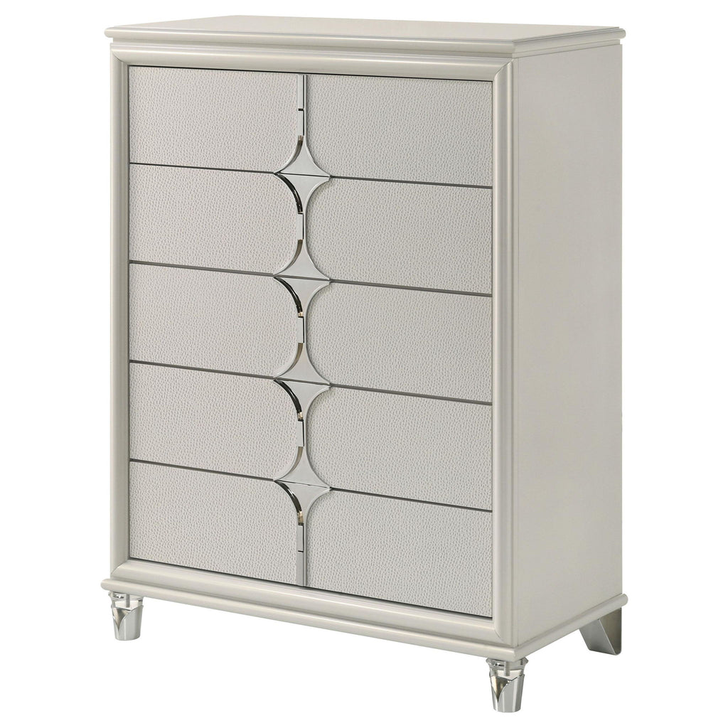 Discover elegance and functionality with this beautifully crafted chest, designed to complement your bedroom suite. The pearl white finish, highlighted by the unique diamond star drawer fronts and chrome metal pulls, exudes a contemporary charm. Acrylic feet with polished chrome caps add a touch of sophistication. Offering ample storage, this chest keeps your space organized while enhancing your room’s aesthetic. Experience the perfect blend of style and practicality with this exceptional piece.