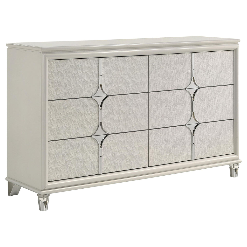 Indulge in the ultimate bedroom experience with this complete bedroom set, designed for modern elegance and luxurious comfort. The set includes a stunning bed, nightstand, dresser with mirror, and an optional chest, all finished in a sophisticated pearl white. Each piece features unique diamond star designs, chrome accents, and thoughtful touches like touch LED lighting and acrylic legs. This collection seamlessly combines contemporary style with practical functionality. Transform your bedroom into a haven of chic sophistication with this exquisite set.