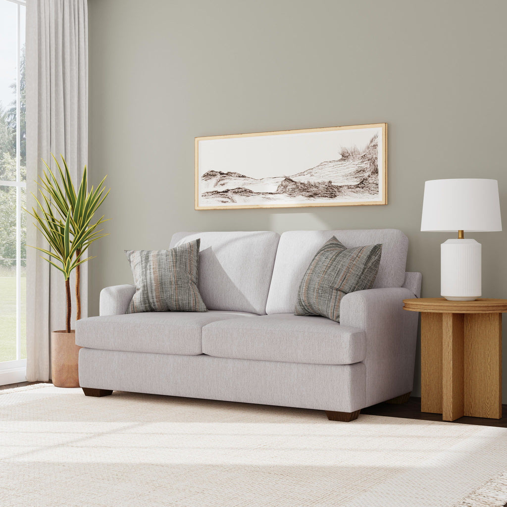 The Olivia loveseat embodies classic charm and modern durability. It features clean lines along the T-cushion mailbox arms and box-border back cushions, while reversible Comfort Coil seat cushions deliver enduring comfort and resilience. Accompanied by two square accent pillows, this loveseat brings a touch of elegance to any space, supported by a robust kiln-dried wood frame and chic square-tapered legs. The good life made better.™