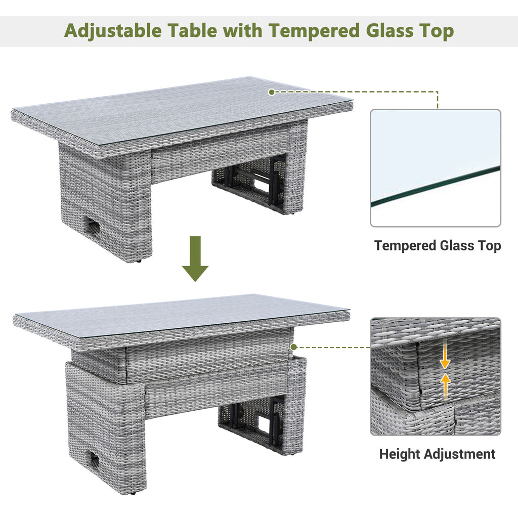 - Adjustable Table - Featuring a versatile adjustable-height table with a durable tempered glass top, this set accommodates dining, working, or relaxing activities. The table's sleek glass surface and sturdy frame add a modern, stylish touch to any outdoor space while being easy to maintain.