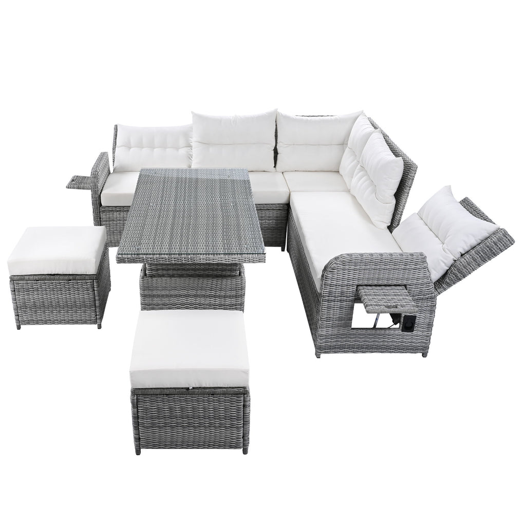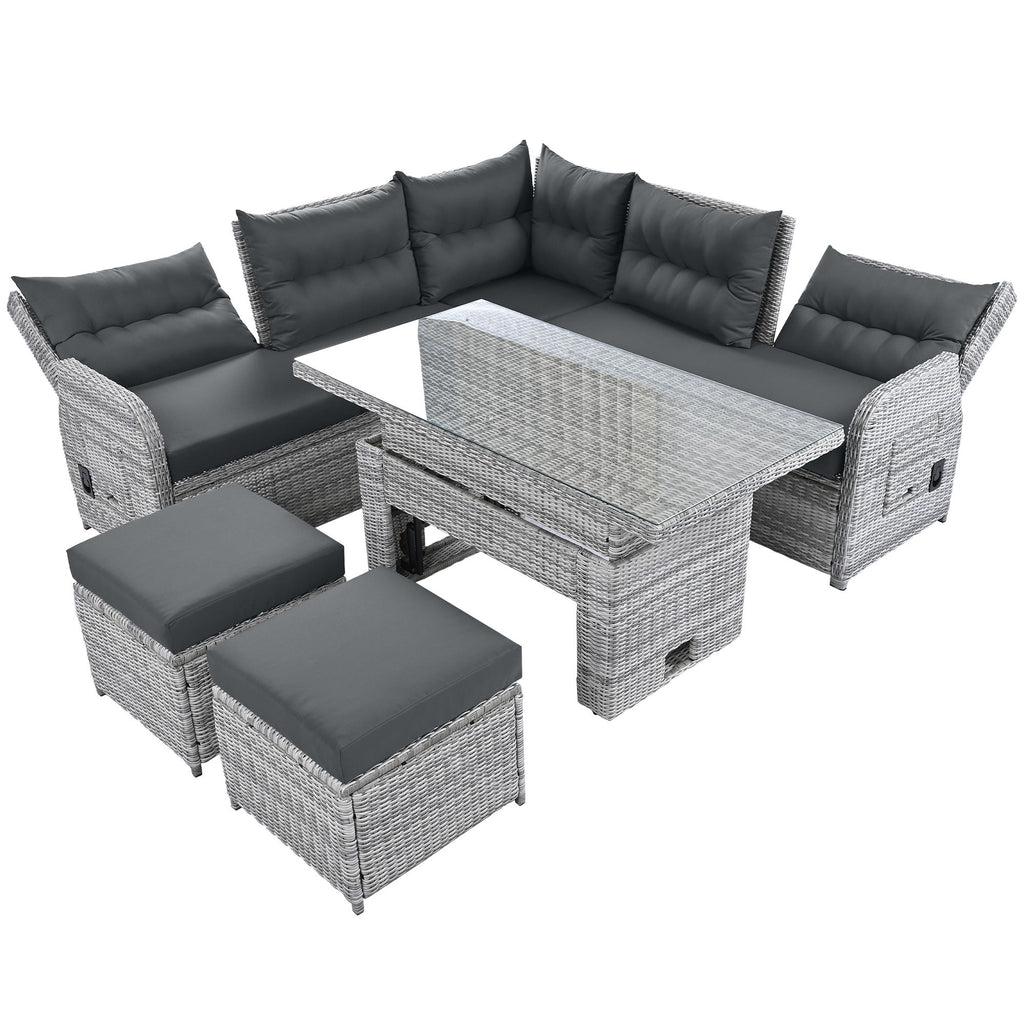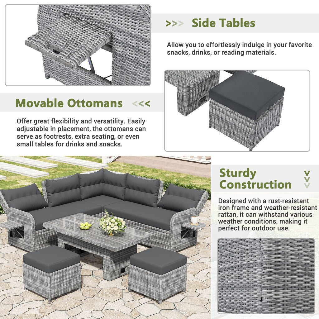 Outdoor Furniture Set Patio Rattan Furniture Set With An Adjustable Table, Recliners With Extendable Side Tables, And 2 Ottomans For Patio, Lawn, Backyard, Pool - Gray