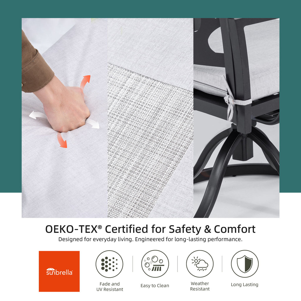 - Sunbrella Cushions: Cushions are made with premium Sunbrella fabric in Cast Silver, offering superior fade, stain, and weather resistance with zippered, removable covers and high-density foam for lasting comfort.