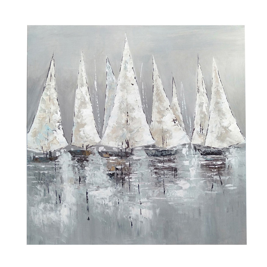 The Crestview Collection Pacific Sails Canvas is 100-percent hand painted and features ships with their sails aloft on calm waters. The artist has selected grey tones with brown and tan on the boats to depict this peaceful gathering on the water. This painting on canvas is 40-inches square by 1.5-inches deep and will look beautiful hung on a wall in your coastal style home or office decor.