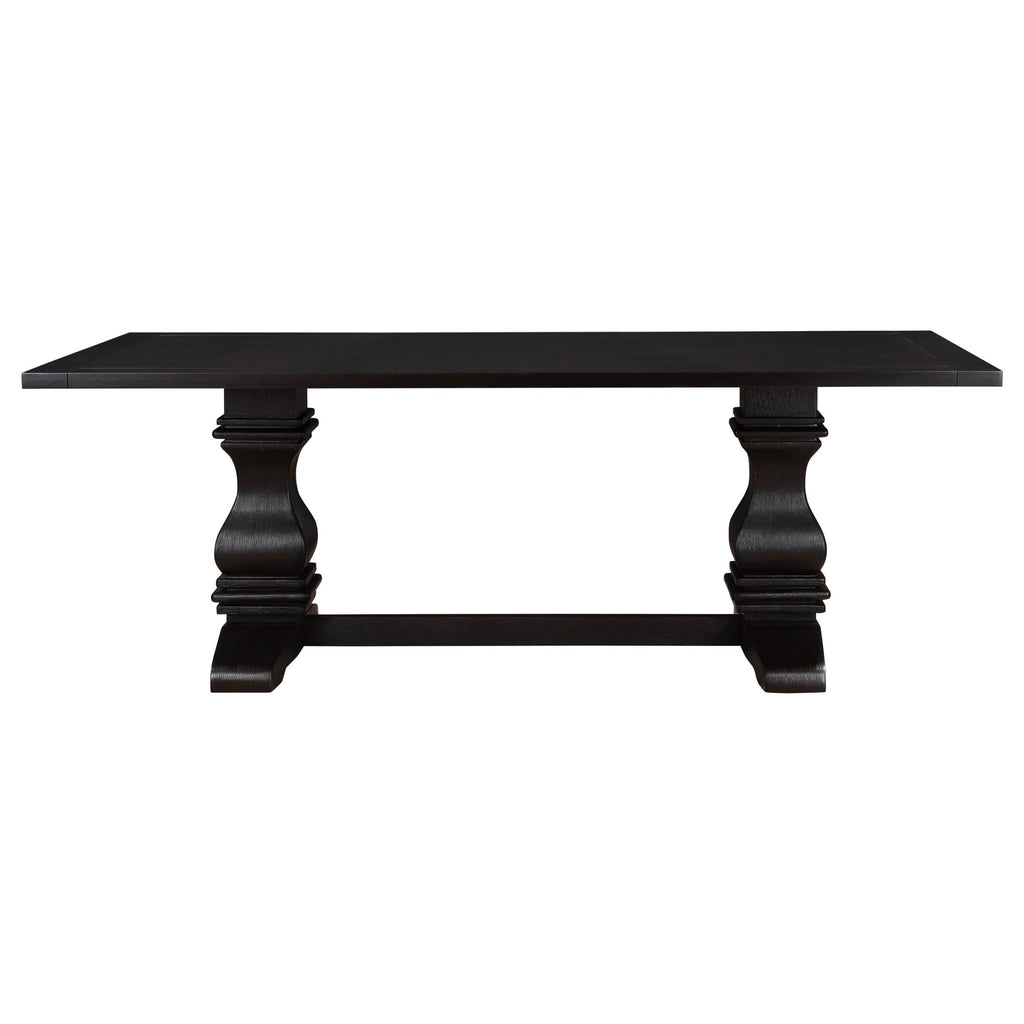 This spectacular 7-piece dining room set is a magnificent addition to the home. Rectangular dining table is meticulously crafted from wood with crisp straight lines. It sits on two broad legs fashioned with curved lines and defined angles with a trestle-like base. The four side chairs have luxurious cushions and rolled seatbacks with button tufting while the two armchairs also have stylish rolled armrests. Chairs are wrapped in stunning white fabric that goes well with contrasting dark nailhead trim and leg finish.