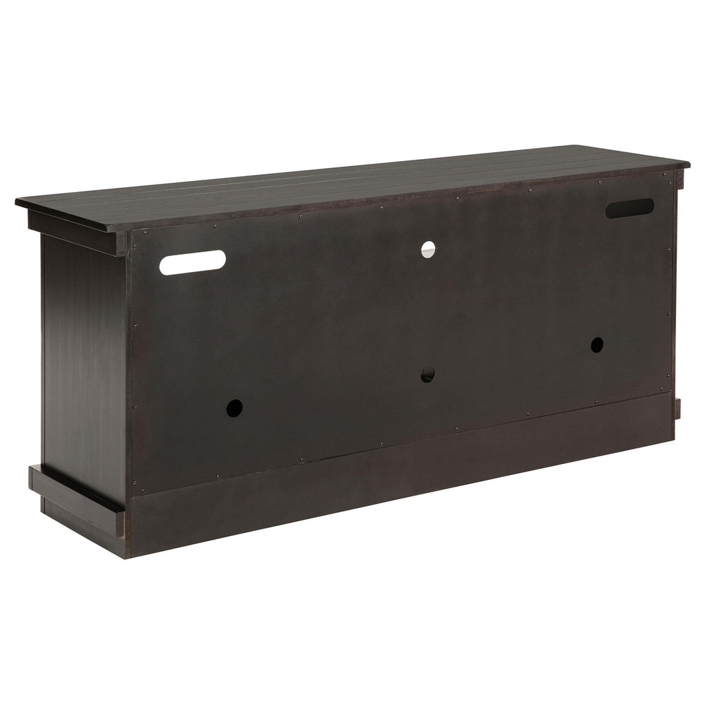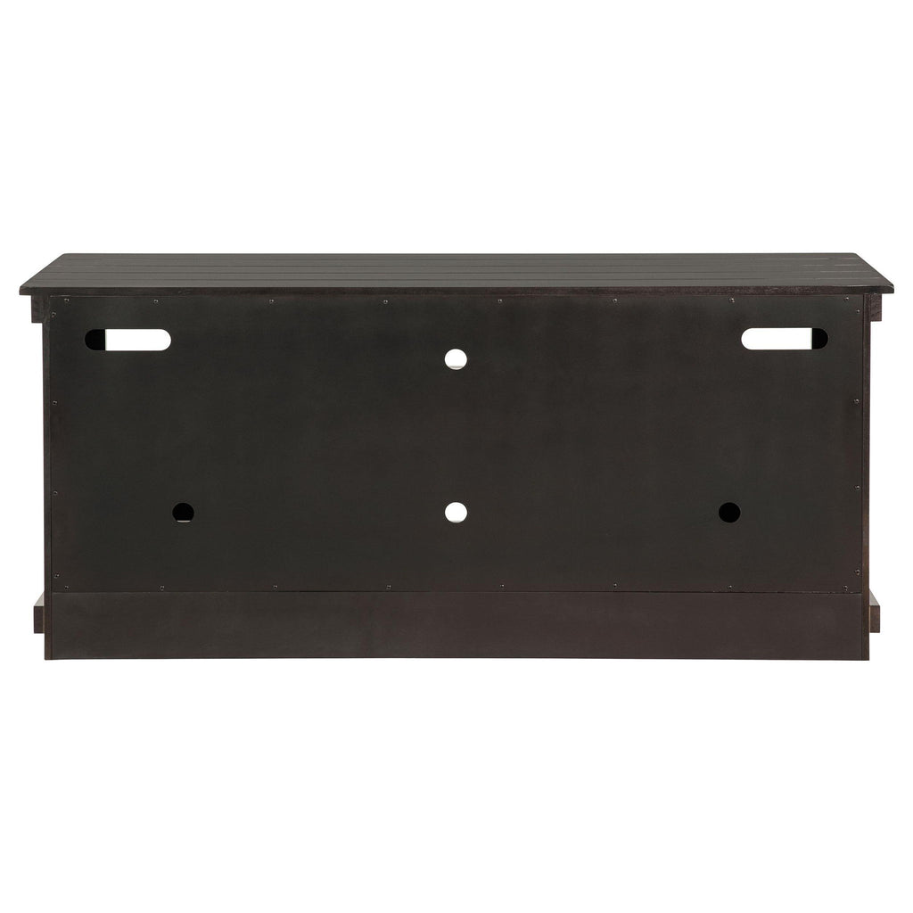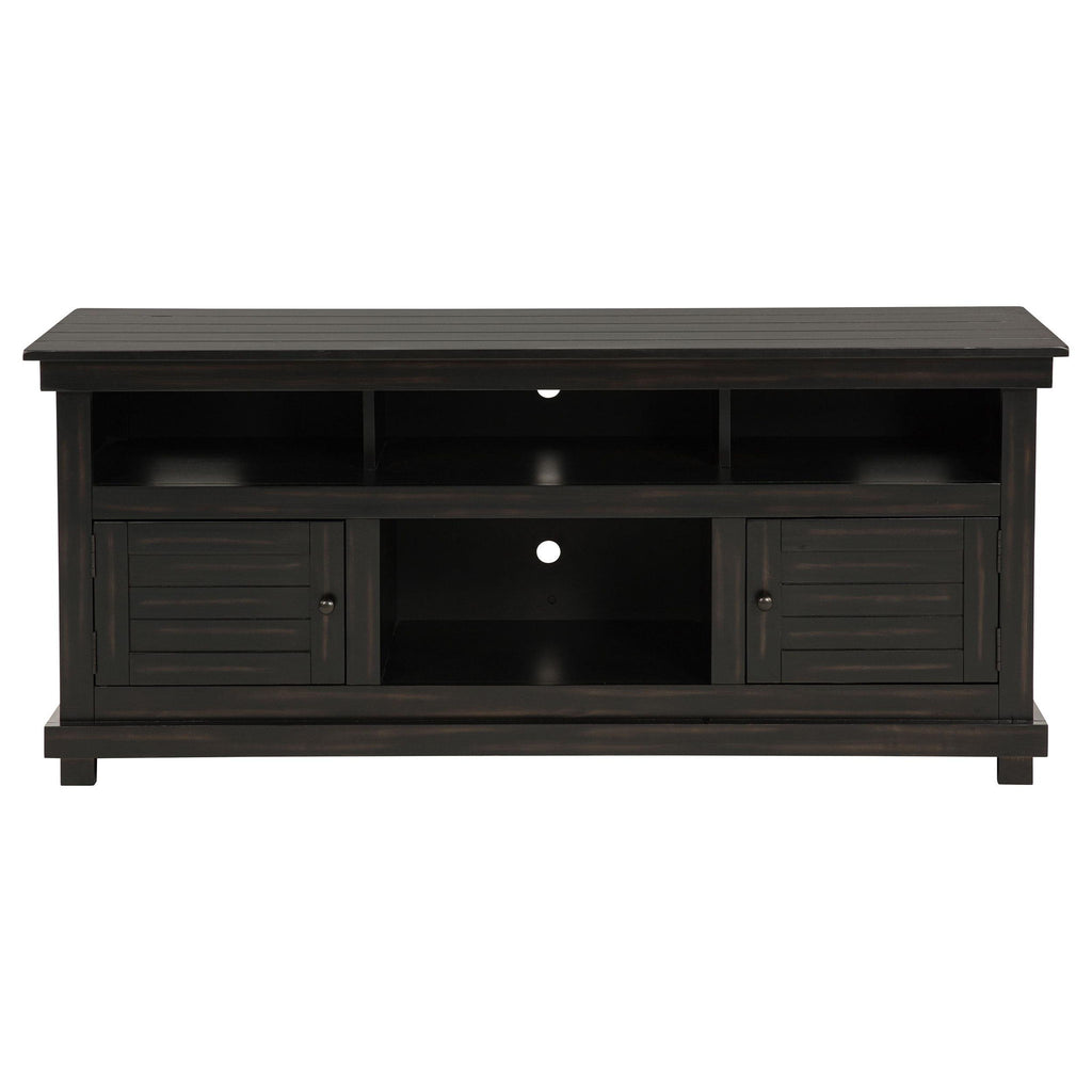 Complete a media center in your inviting home with a modern farmhouse TV stand. It's an approachable design with roughhewn wood details that create texture and dimensionality in your living space. Two shelves and six compartments create ample storage, perfect for everything from peripherals and accessories to personal decor. The media console features a clean-lined silhouette with a slim profile, perfect for a flat panel or wall-mounted television. This TV stand accommodates televisions up to 65 inches.