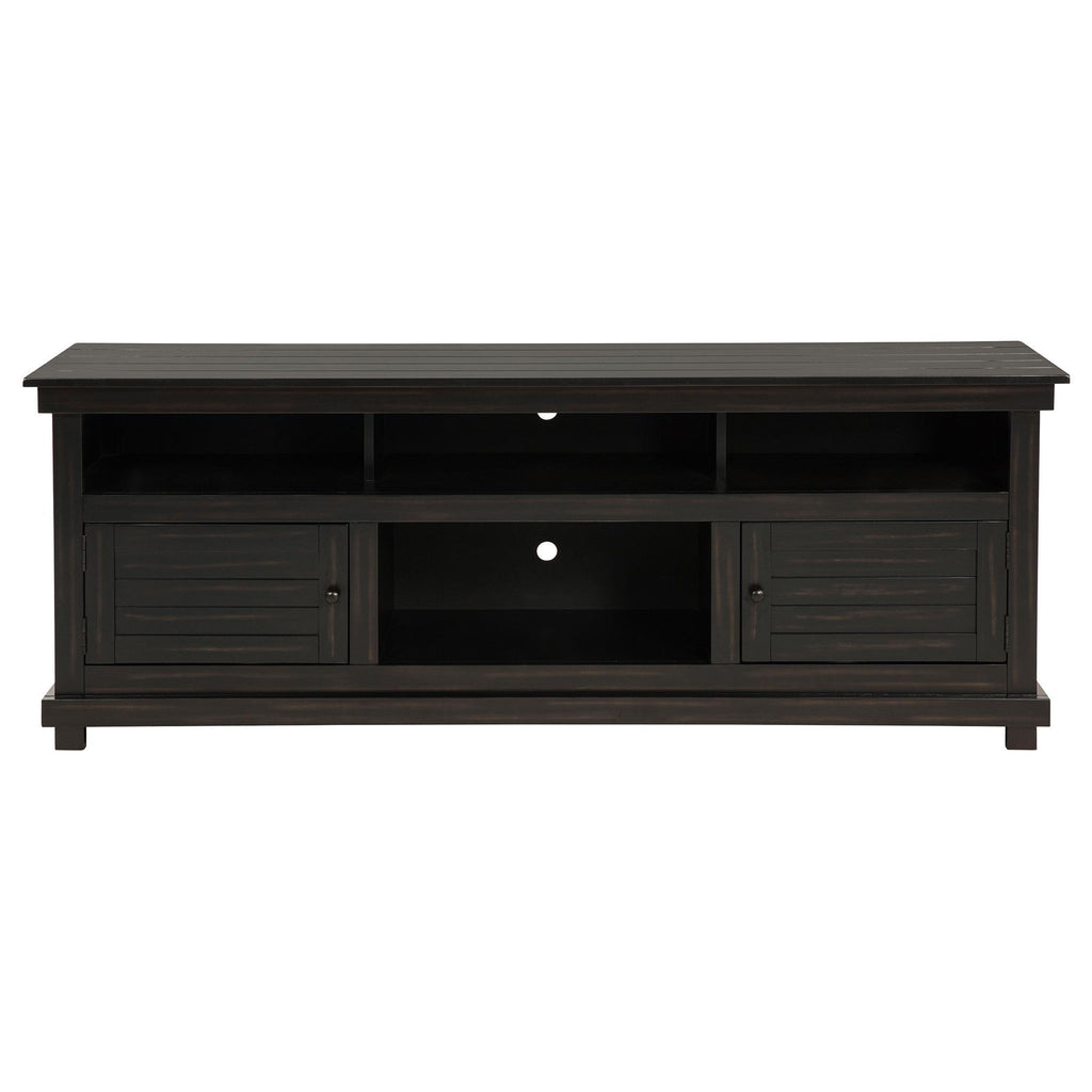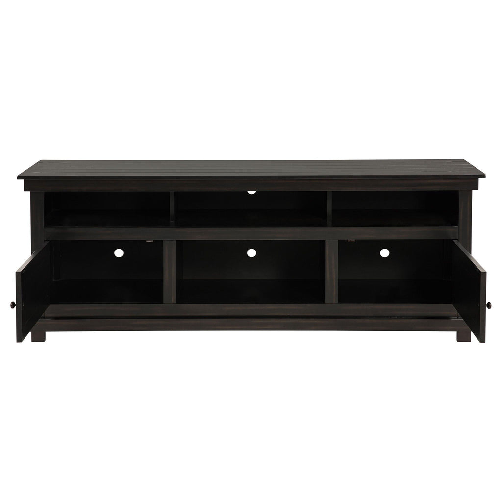 Introduce expansive storage underneath your flat panel television with this modern farmhouse TV stand. It's a wooden design with roughhewn details that offer charming texture and casual allure in your living room or den. Two cabinets offer decorative doors while providing plenty of interior storage that helps to create a tidy look in your living room. Two open shelves create space for media and gaming components mixed with decor that offers a personalized touch. Cord management openings complete the design, making for a streamlined design that accommodates televisions up to 75 inches placed on top or mounted above.