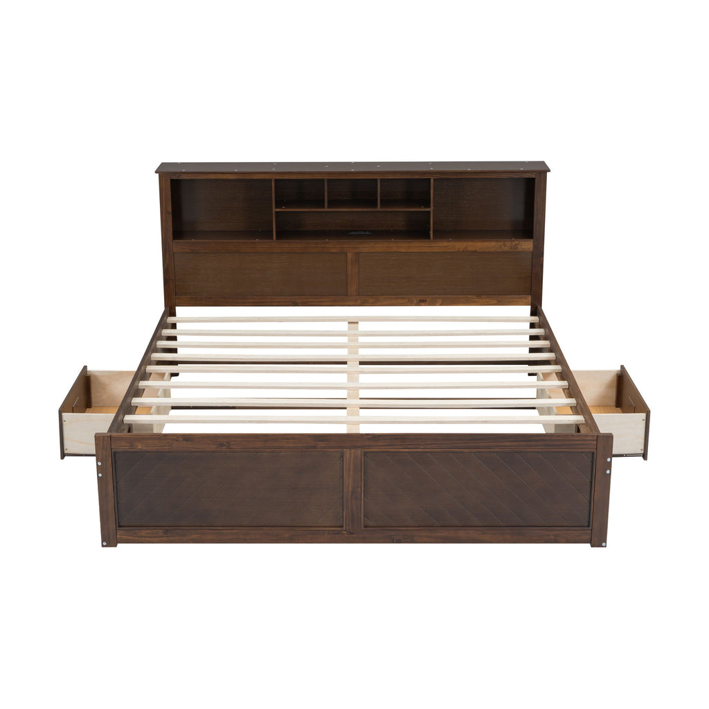 King Size Platform Bed With Multi Storage Headboard, USB And Drawers - Wood