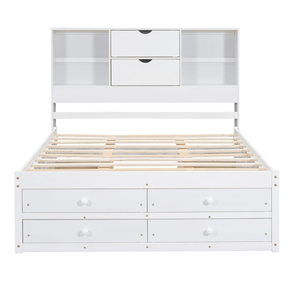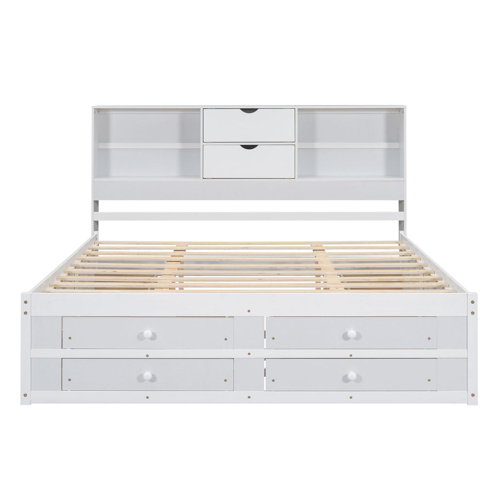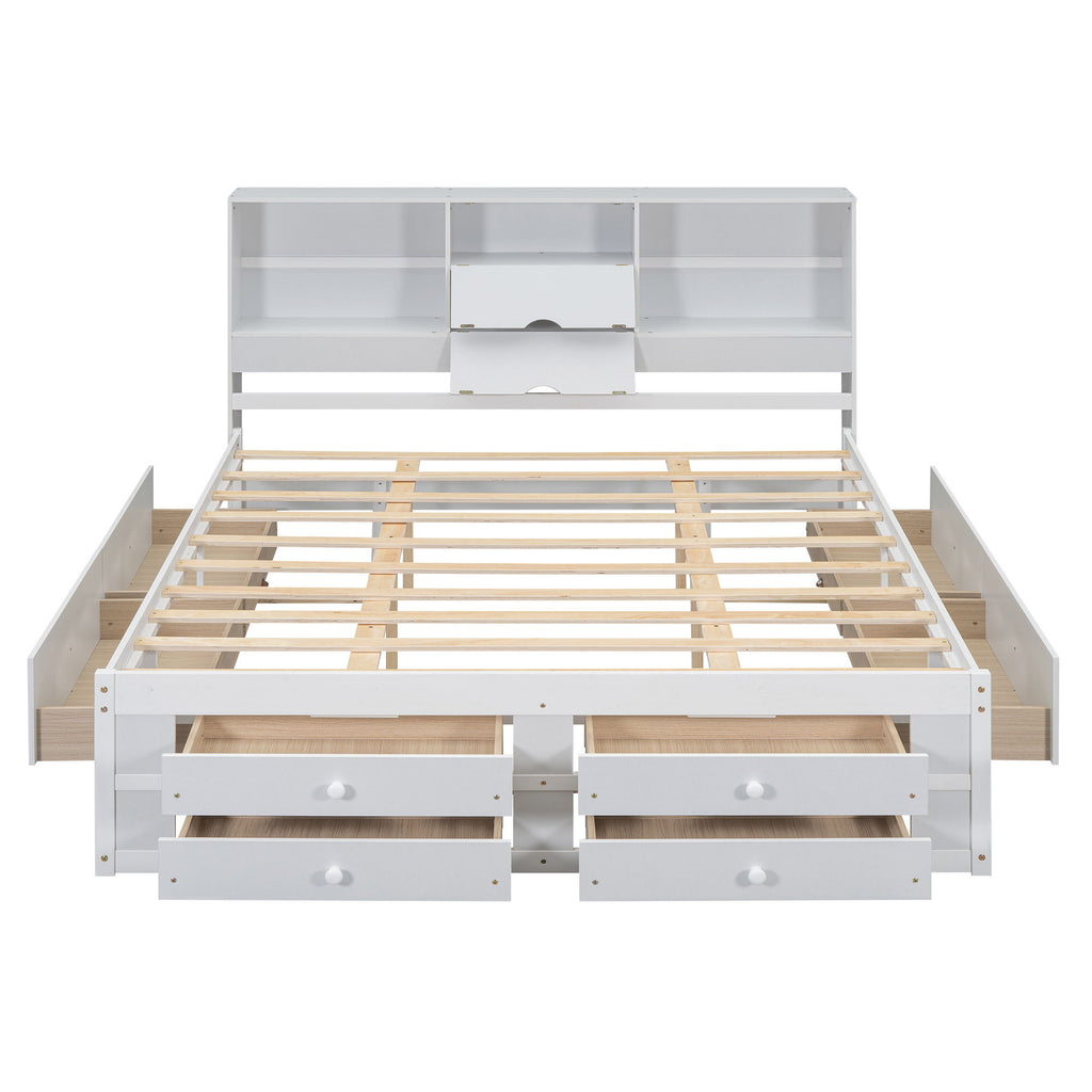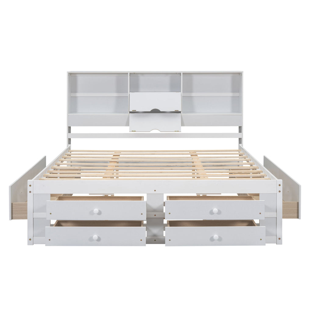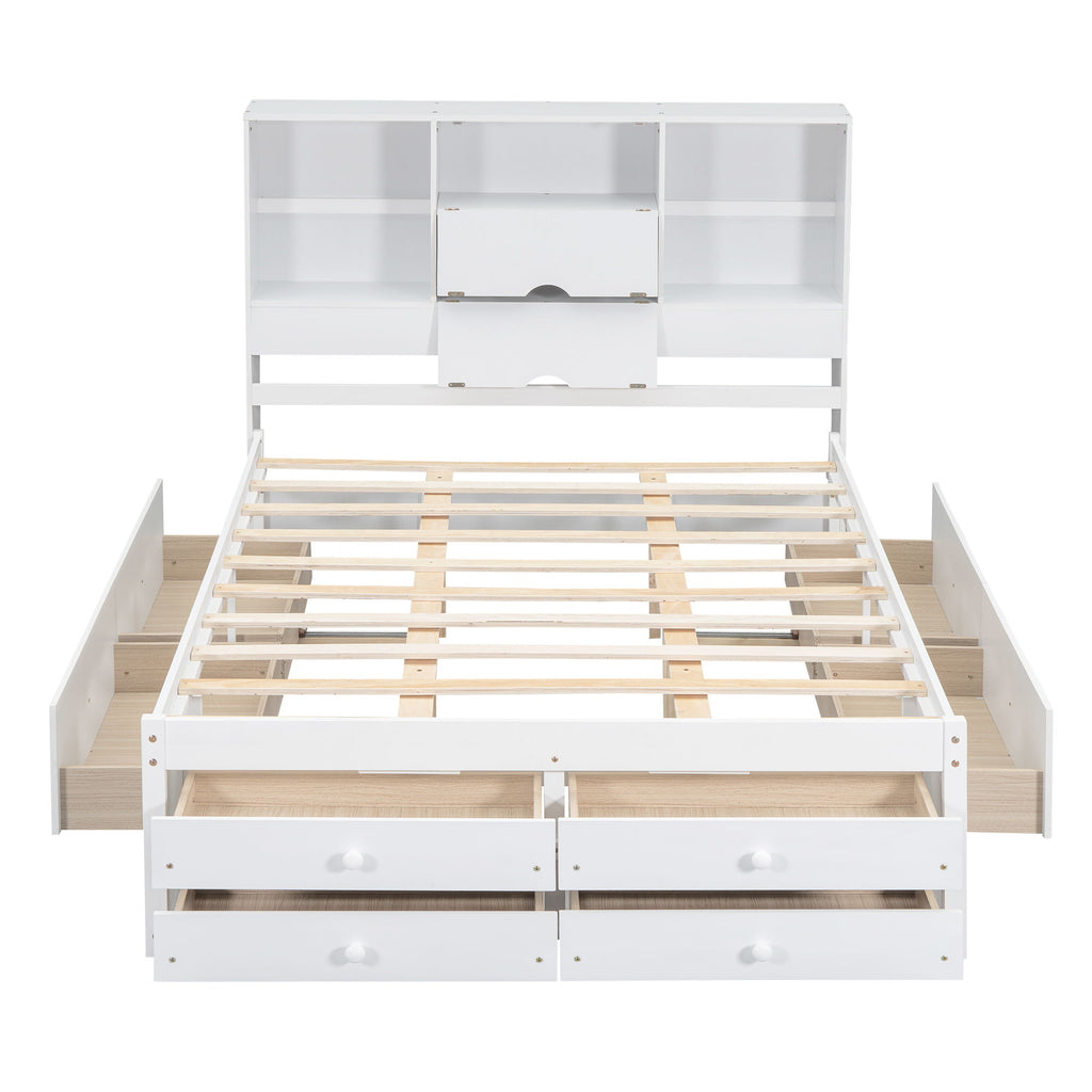 Queen Size Platform Bed With Storage Headboard And 8 Drawers - White