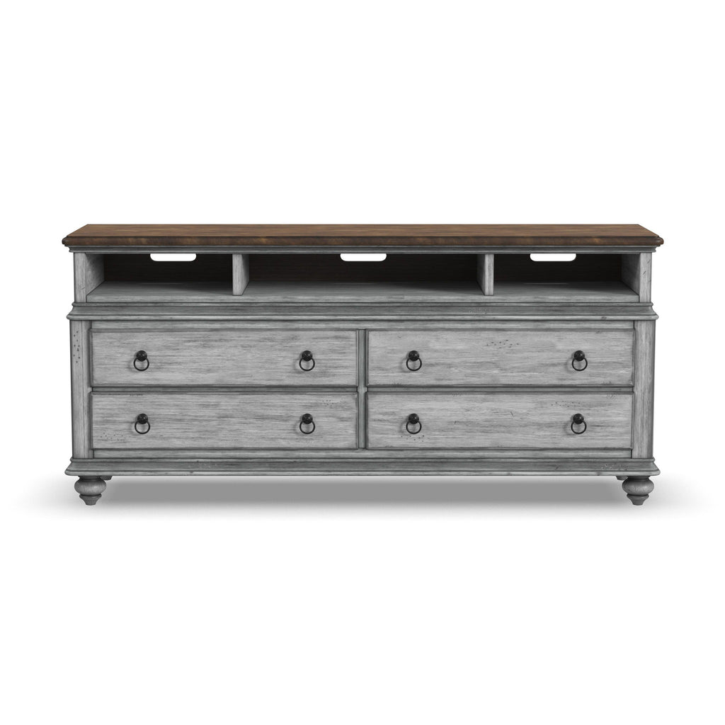 Add cottage-inspired charm to the spaces where you watch your favorite shows with the Plymouth entertainment base. Featuring four drawers with premium ball-bearing glides and three open compartments with cable access, this spacious entertainment base provides ample room for storing electronics, media and gaming accessories. A planked top creates the ideal surface for your TV, while two built-in electrical outlets and USB ports add convenience for keeping devices powered. With a weathered graywash finish, antique gunmetal pulls and turned bun feet, this base brings a warm vintage look to living spaces and family rooms.