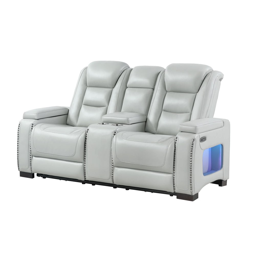 Power Console Loveseat With Power Headrest USB LED And Bookshelf Arms - Grey
