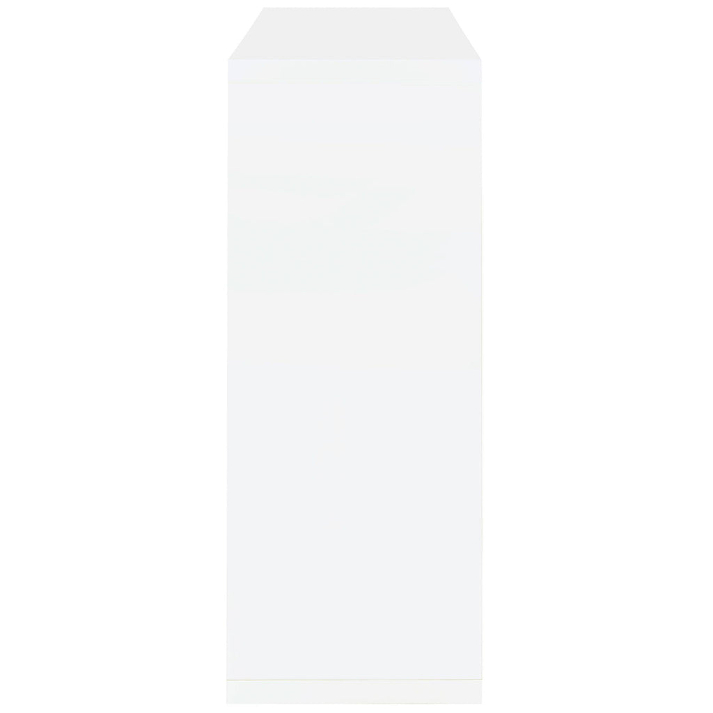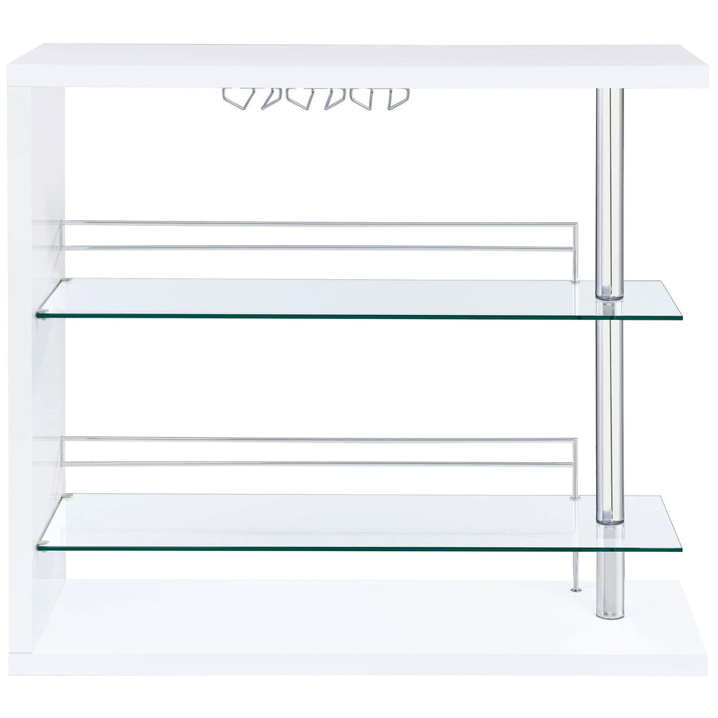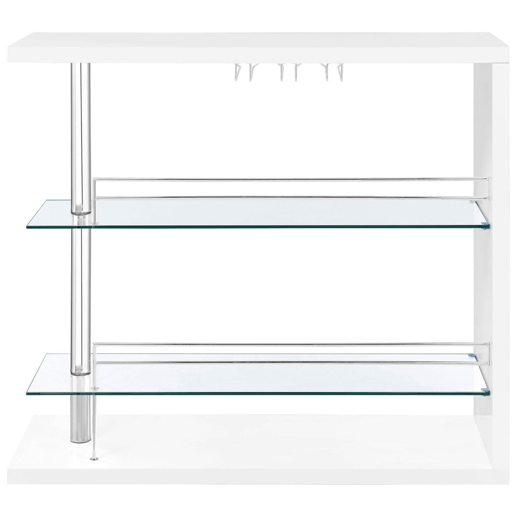 This contemporary bar unit will instantly elevate your hosting abilities. Convenient and versatile, it includes two glass shelves to accommodate your choice of beverages. It comes complete with a handy wine glass rack, allowing you to keep all your bartending accessories in one place. Its attractive design is gracefully pulled together with smooth, sleek lines, chrome accents, and an eye-pleasing gloss white finish. This unit looks especially chic and glamorous in a gathering space with a modern decor.