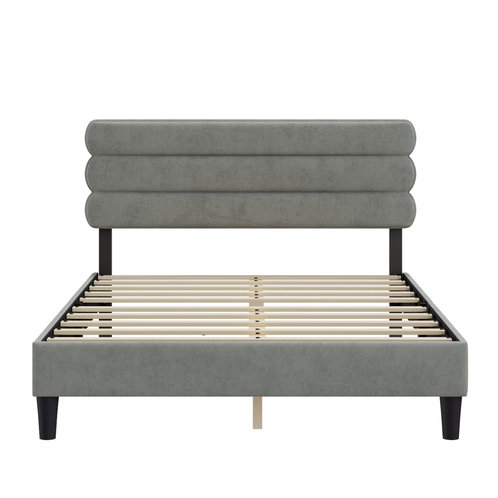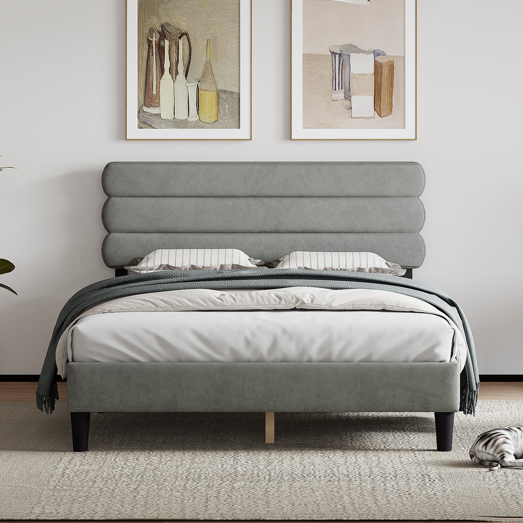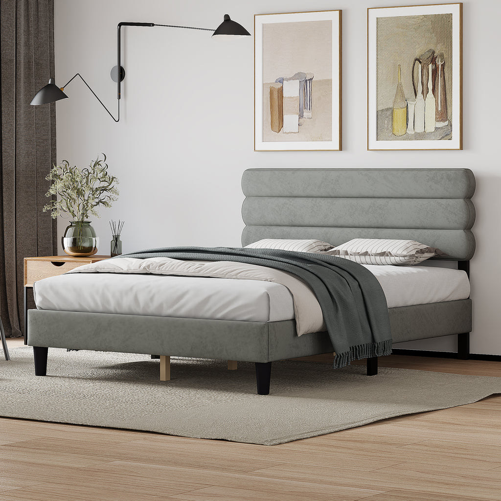 - Elegant Design: Full-size bed frame boasts an exquisite design, featuring a headboard crafted from high-quality linen fabric and enveloped in high elastic memory foam. The cushioned side rails provide exceptional comfort for relaxation, while the specially designed Velcro slats make assembly a breeze, effectively eliminating noise