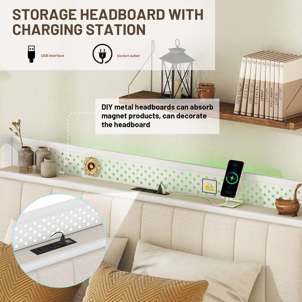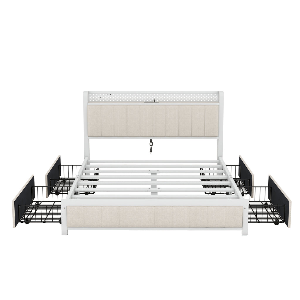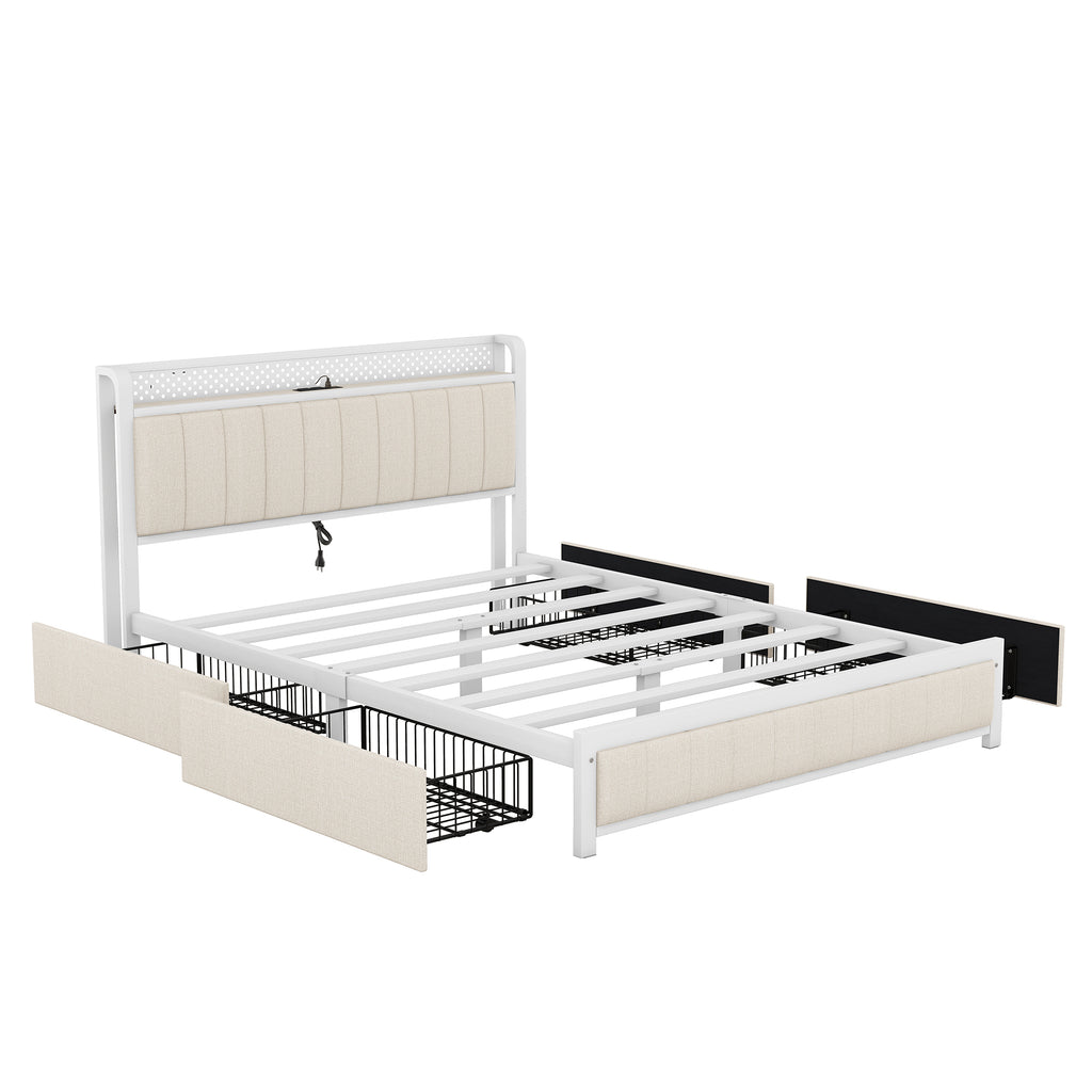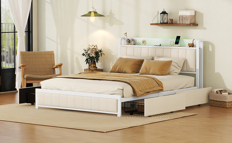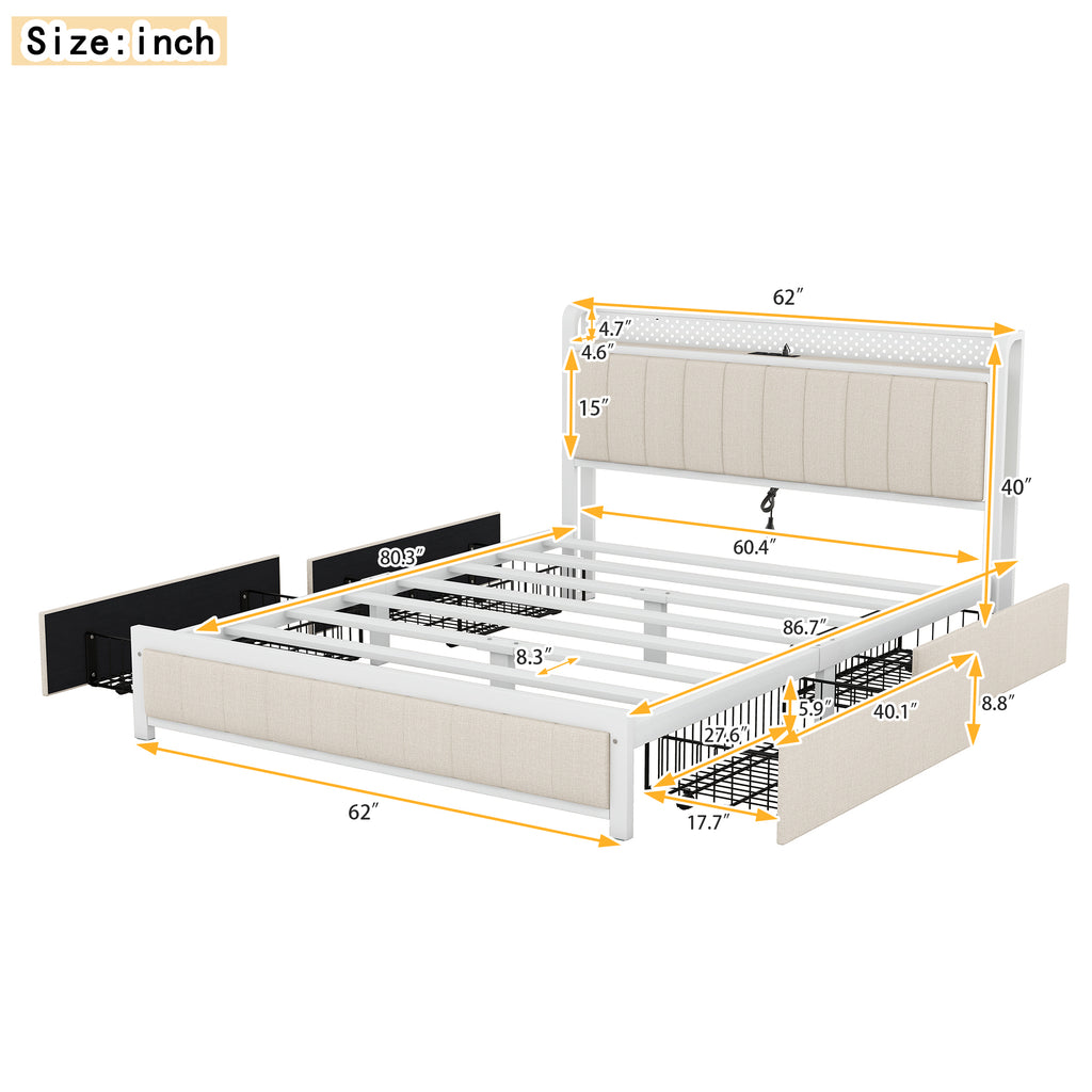 Queen Bed Frame with LED Headboard, Upholstered Bed with 4 Storage Drawers and USB Ports, Beige