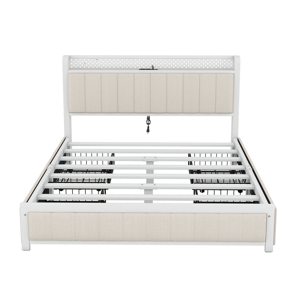 The queen bed upholstered in linen fabric with stitched surface, with LED headboard will add sophisticated style to any bedroom. A shelf on headboard and 4 drawers to provide large storage space.